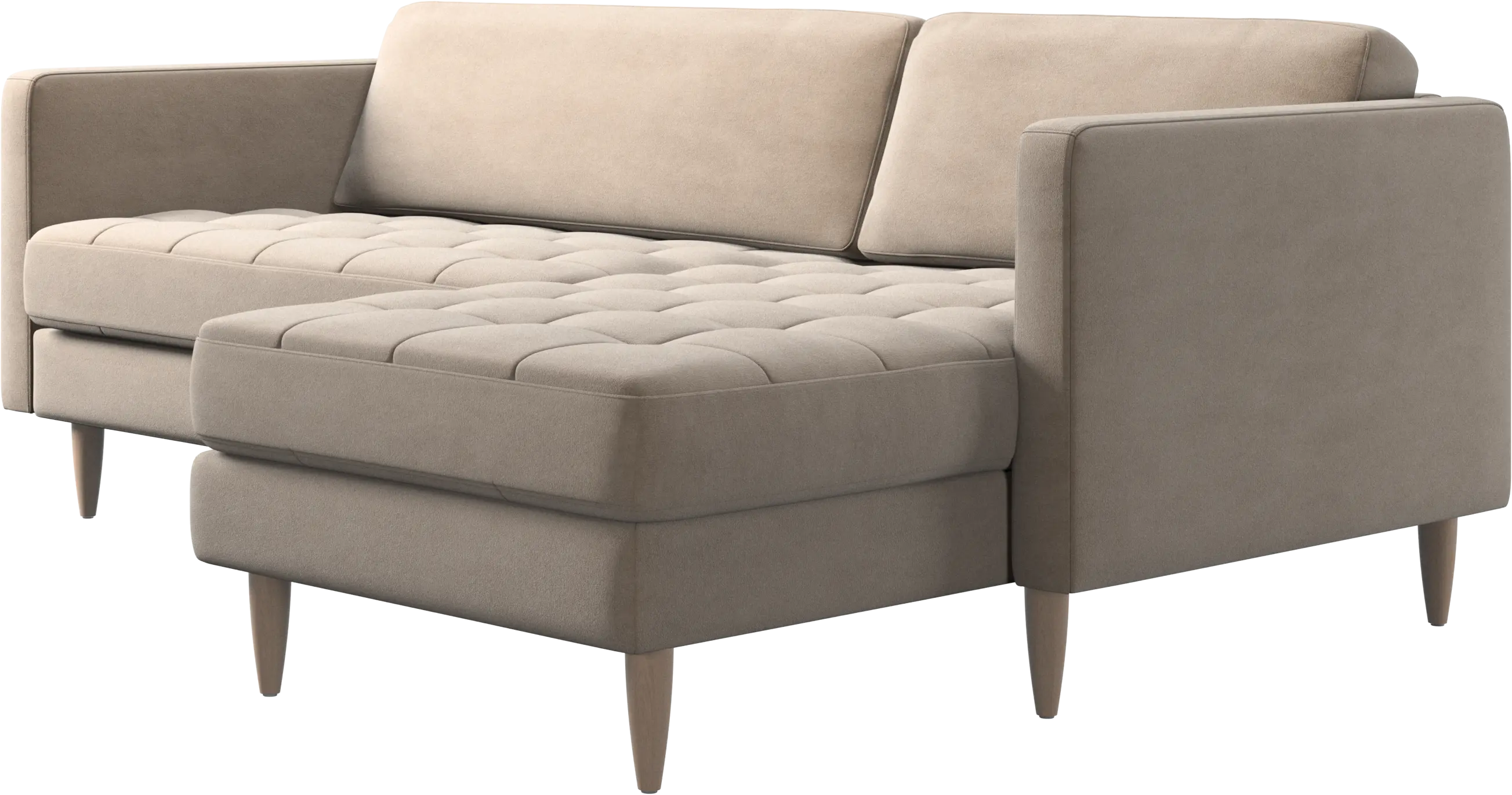 A light look and slim proportions make the Osaka sofa perfect for small homes, while a subtle feminine look and a touch of 60s design ensure that the Osaka sofa still packs a style punch. The beautiful tufted seats add visual softness and bring a classic look to your living room. The classic, straight armrests emphasise the clean lines and Scandinavian look. Put your feet up, stretch out or use it as an extra seat – you won’t be sorry for choosing this comfortable chaise longue sofa.