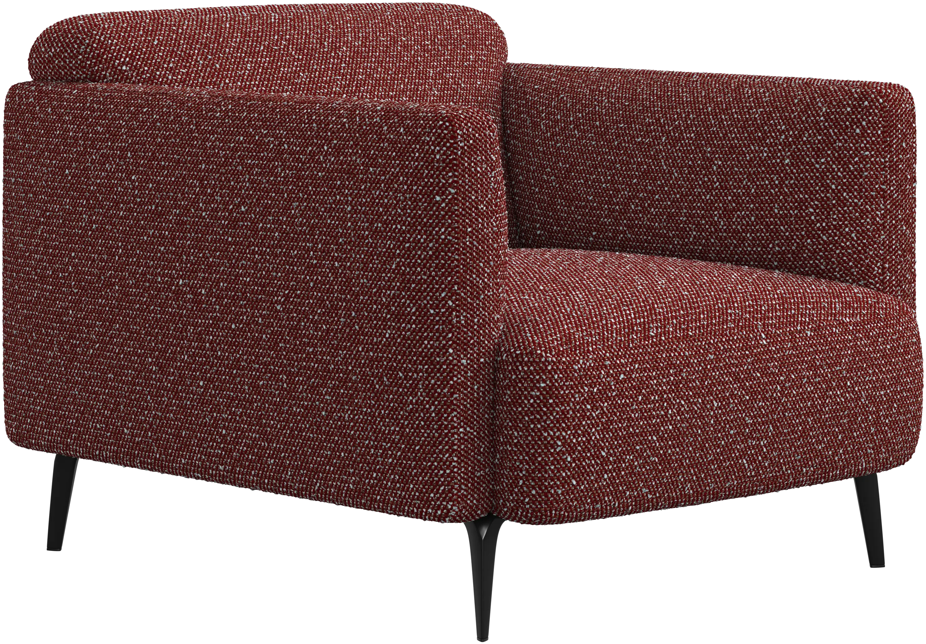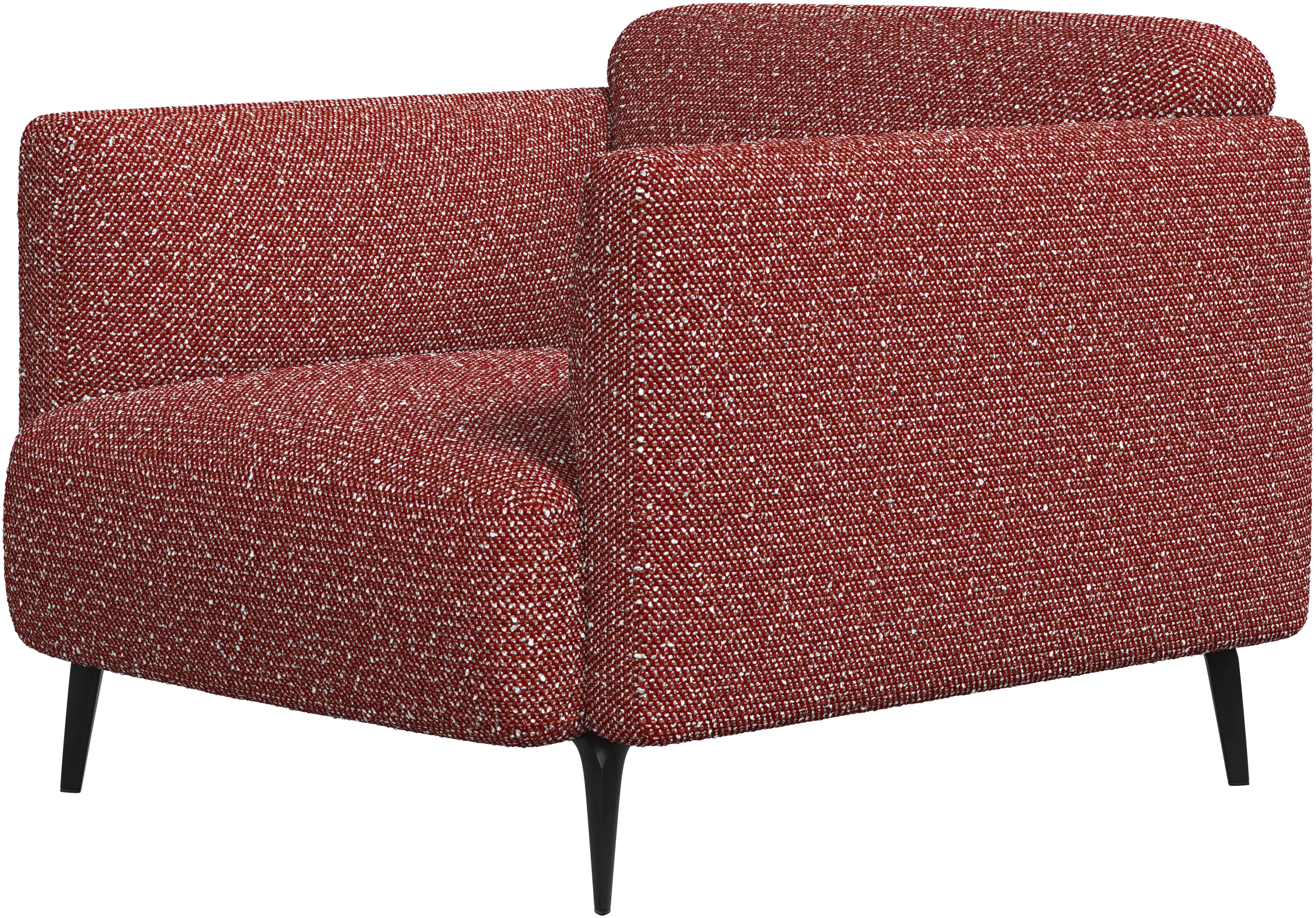 Soft upholstered armrests and rounded edges, gives a lounge feeling underlined by the low back.