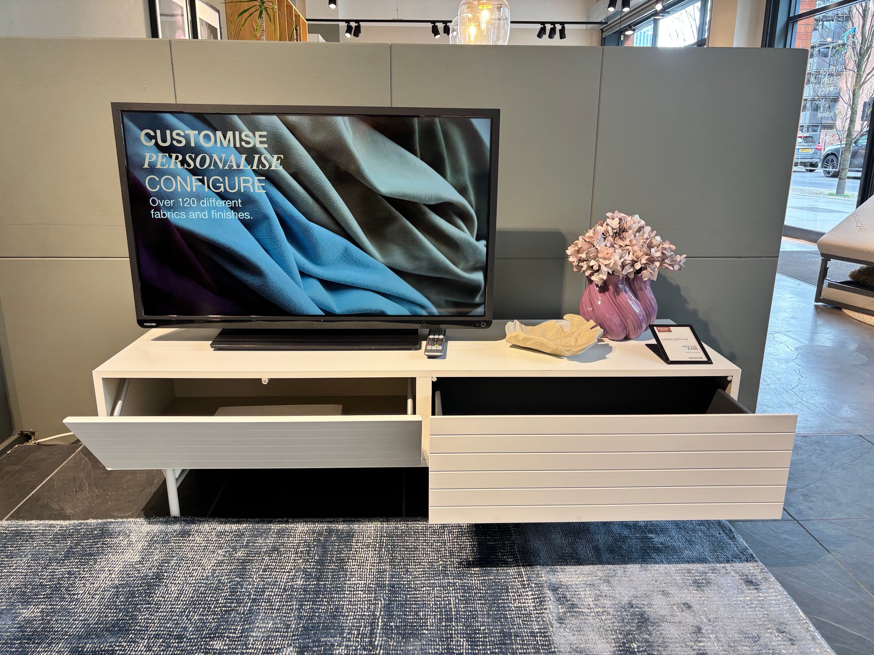 Looking sleek, elegant and exclusive, Lugano will solve all your storage needs. It has carved fronts with drop down door and a drawer. The media unit is available for delivery or collection from our Manchester showroom, for further details contact us on 0161 228 7111 / manchester@boconcept.co.uk