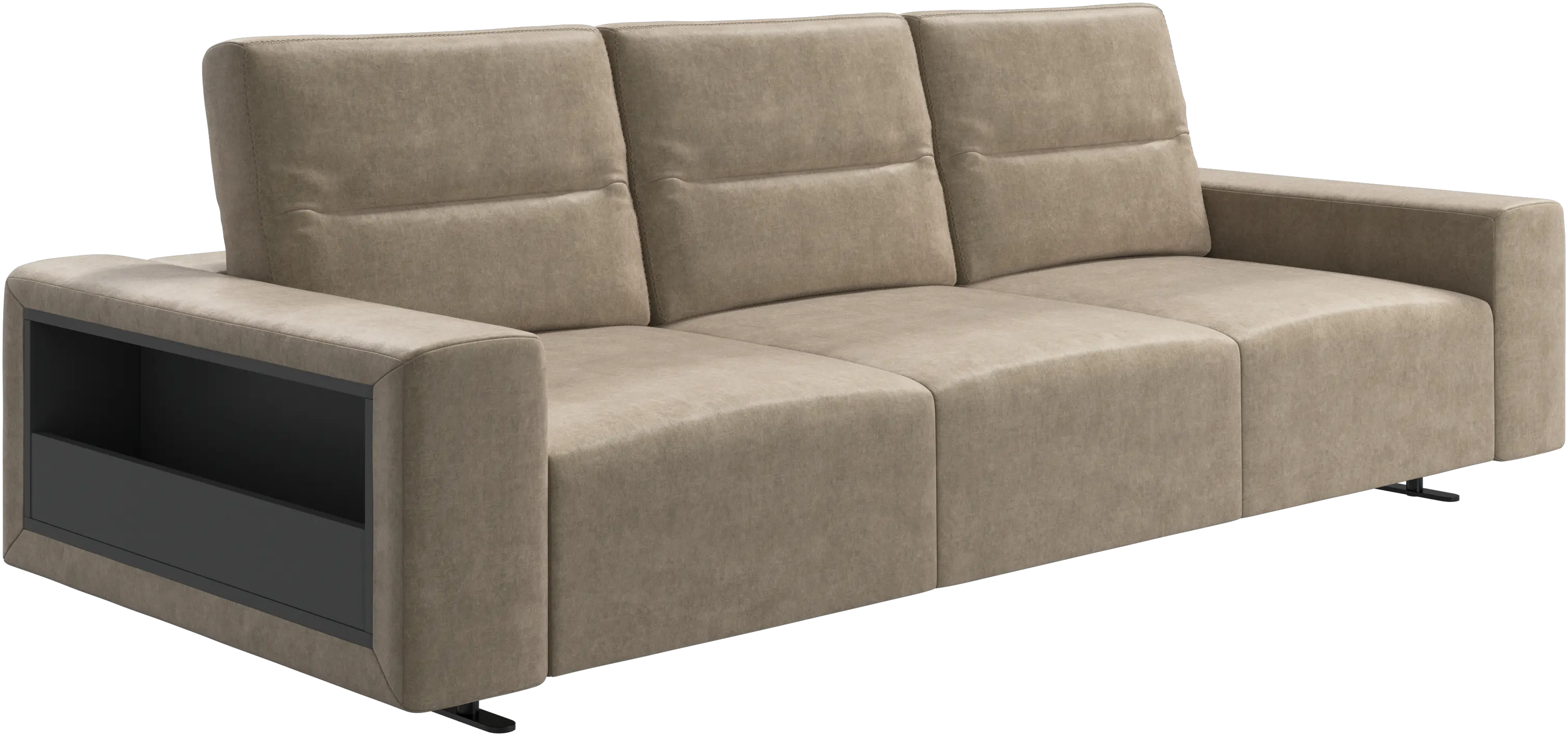 We know. It’s beautiful. But the modern Hampton sofa is much more than just good looks. A low base, a stunning loft look, adjustable backrests for comfort and visual impact – the Hampton sofa is the perfect personal retreat. Put your feet up, stretch out or use it as an extra seat – you won’t be sorry for choosing this comfortable chaise longue sofa. And with clever built-in storage in the armrest, you will always have your living room essentials at hand.