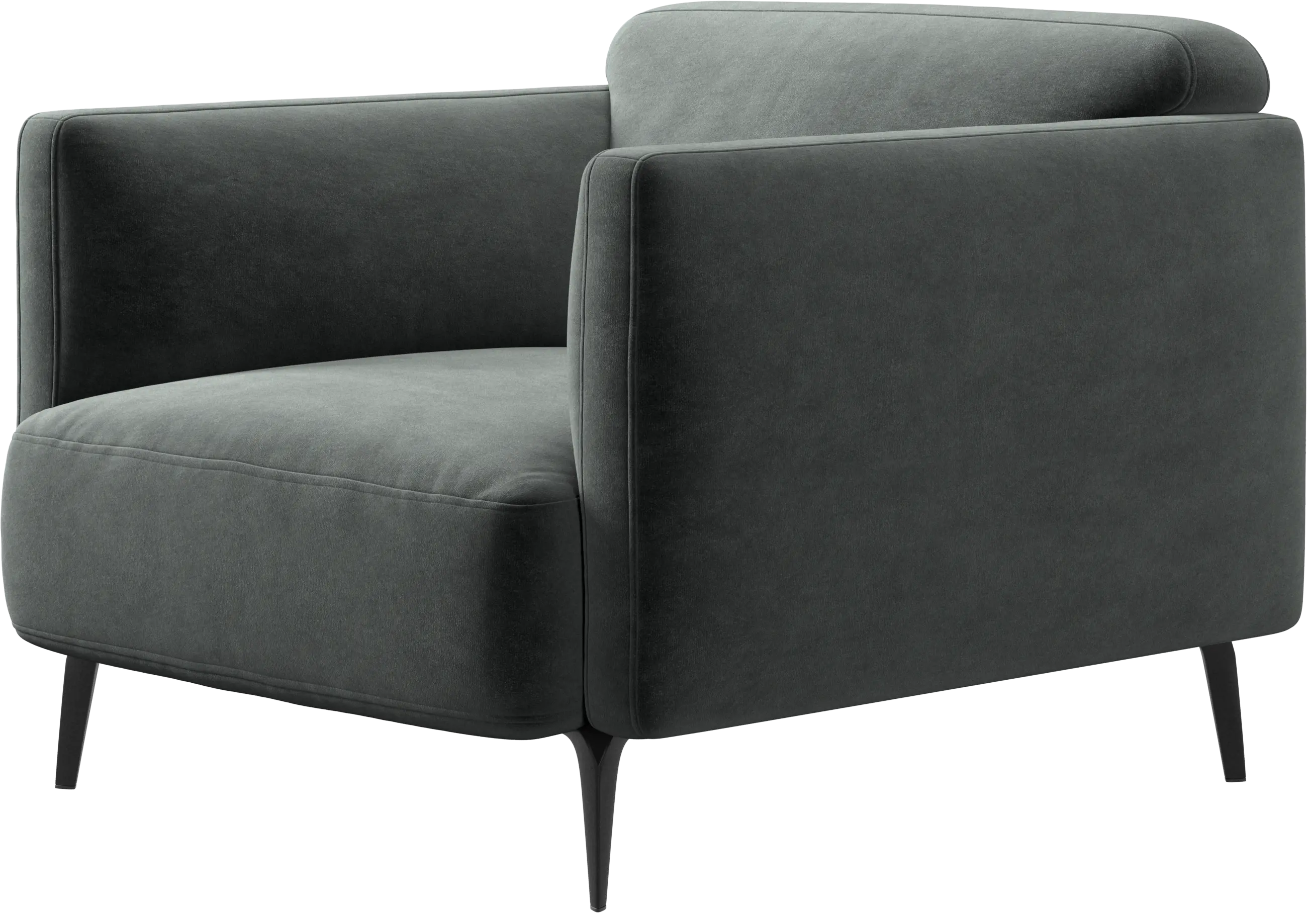 Soft upholstered armrests and rounded edges, gives a lounge feeling underlined by the low back.