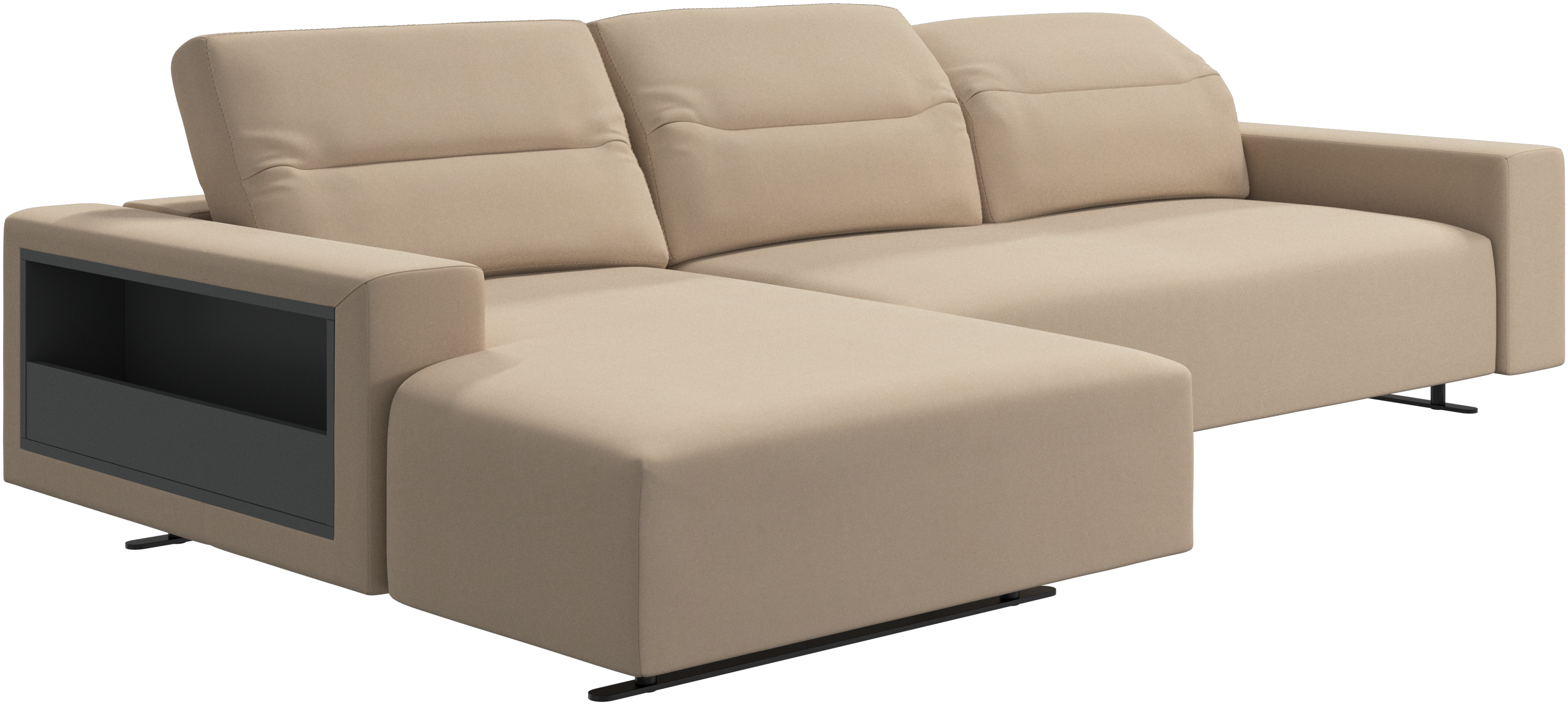 We know. It’s beautiful. But the modern Hampton sofa is much more than just good looks. A low base, a stunning loft look, adjustable backrests for comfort and visual impact – the Hampton sofa is the perfect personal retreat. Put your feet up, stretch out or use it as an extra seat – you won’t be sorry for choosing this comfortable chaise longue sofa. And with clever built-in storage in the armrest, you will always have your living room essentials at hand.