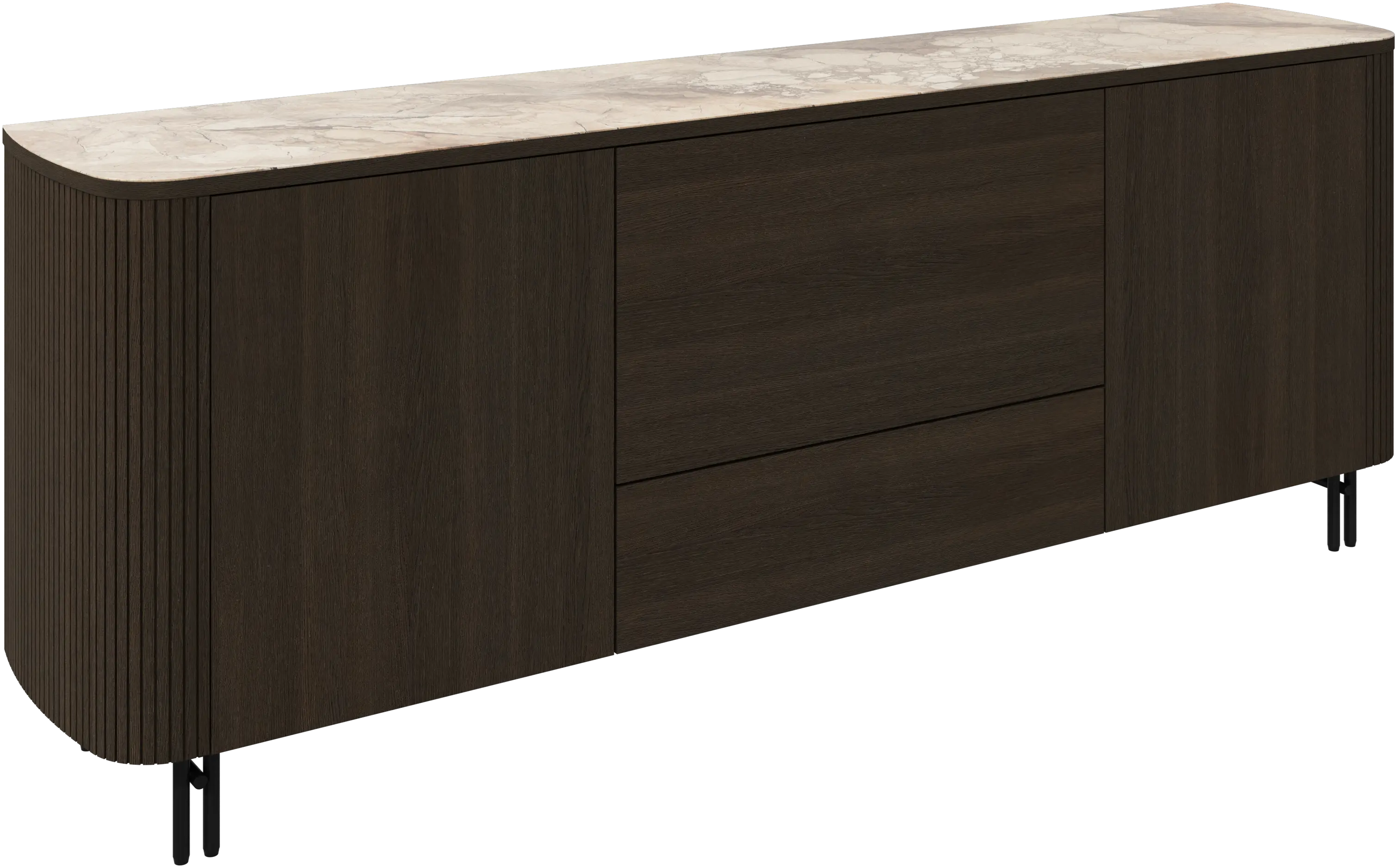 Inspired by mid-century elegance, the Morten Georgsen-designed Santiago sideboard features a versatile drop-down front revealing a wooden shelf, perfect for discreet storage or creating a mini bar area. Its timeless design is enhanced by intricate bevelled details and customisable options, including a selection of ceramic or wood tops and a choice between wooden or matt black metal legs. Available in multiple sizes to suit your interior needs.