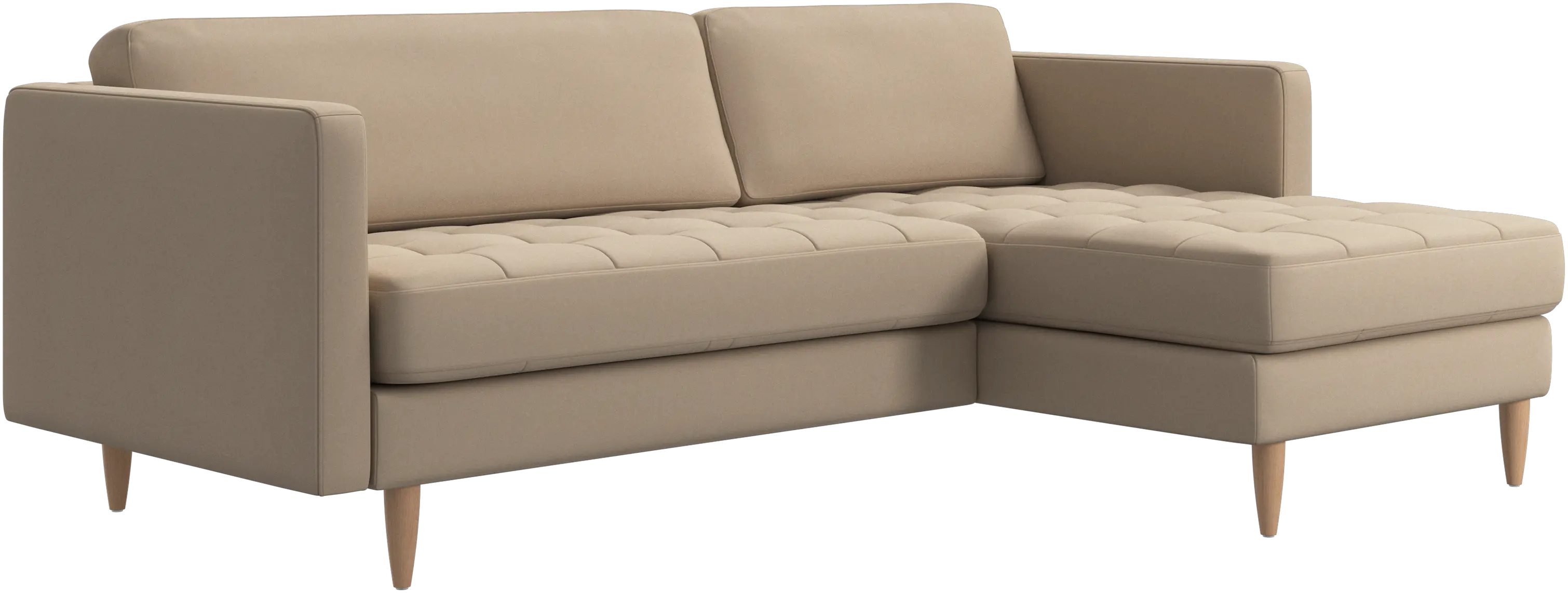 A light look and slim proportions make the Osaka sofa perfect for small homes, while a subtle feminine look and a touch of 60s design ensure that the Osaka sofa still packs a style punch. The beautiful tufted seats add visual softness and bring a classic look to your living room. The classic, straight armrests emphasise the clean lines and Scandinavian look. Put your feet up, stretch out or use it as an extra seat – you won’t be sorry for choosing this comfortable chaise longue sofa.