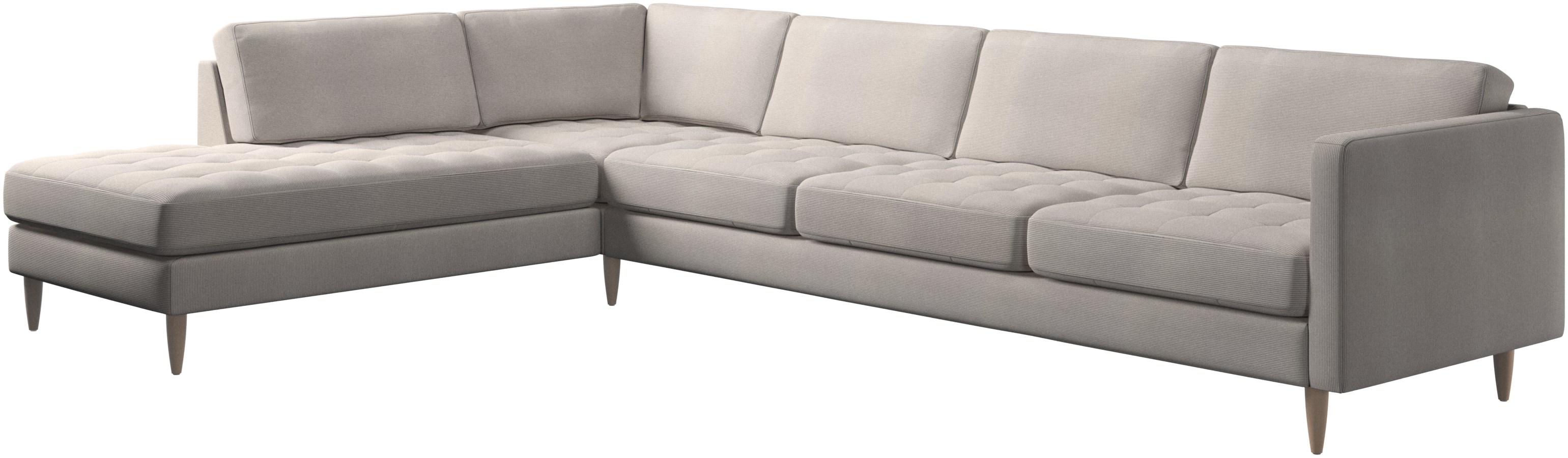 A light look and slim proportions make the Osaka sofa perfect for small homes, while a subtle feminine look and a touch of 60s design ensure that the Osaka sofa still packs a style punch. The beautiful tufted seats add visual softness and bring a classic look to your living room. The classic, straight armrests emphasise the clean lines and Scandinavian look. With plenty of room for the entire family this corner sofa will be the hero of your living room. The open end will create a dynamic, welcoming atmosphere - a true blessing for the integrated areas of open-plan living. Put your feet up, stretch out or use it as an extra seat – you won’t be sorry for choosing this comfortable chaise longue sofa.