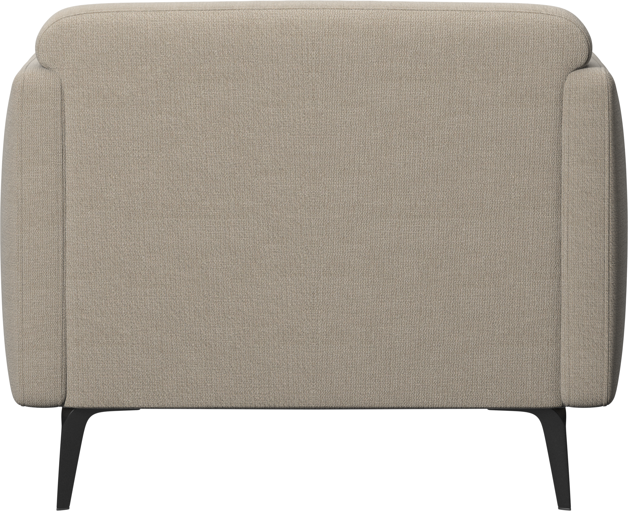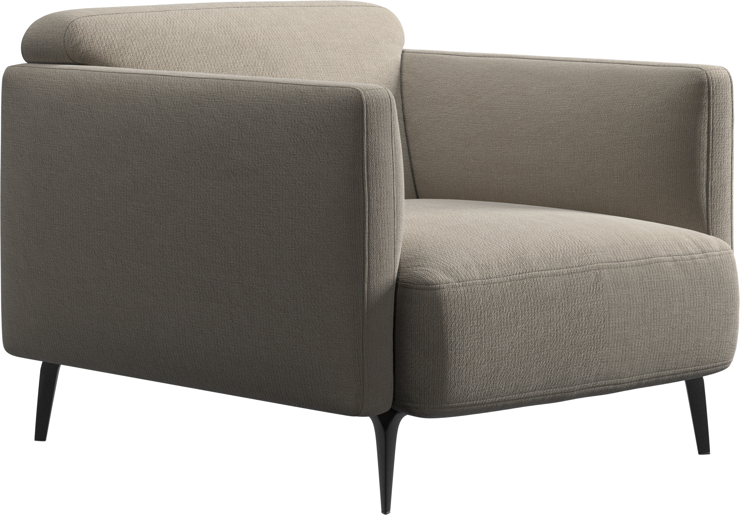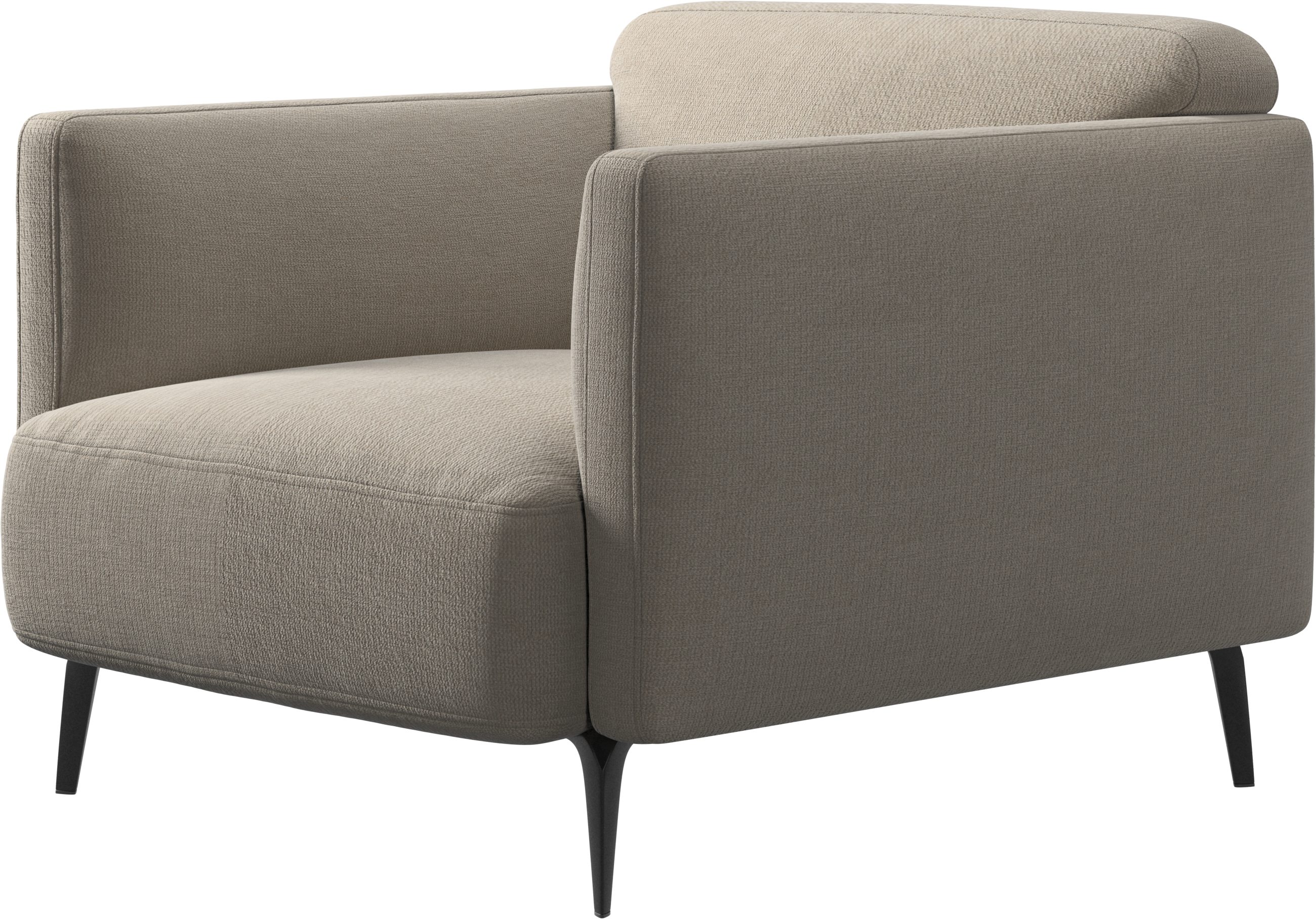 Soft upholstered armrests and rounded edges, gives a lounge feeling underlined by the low back.