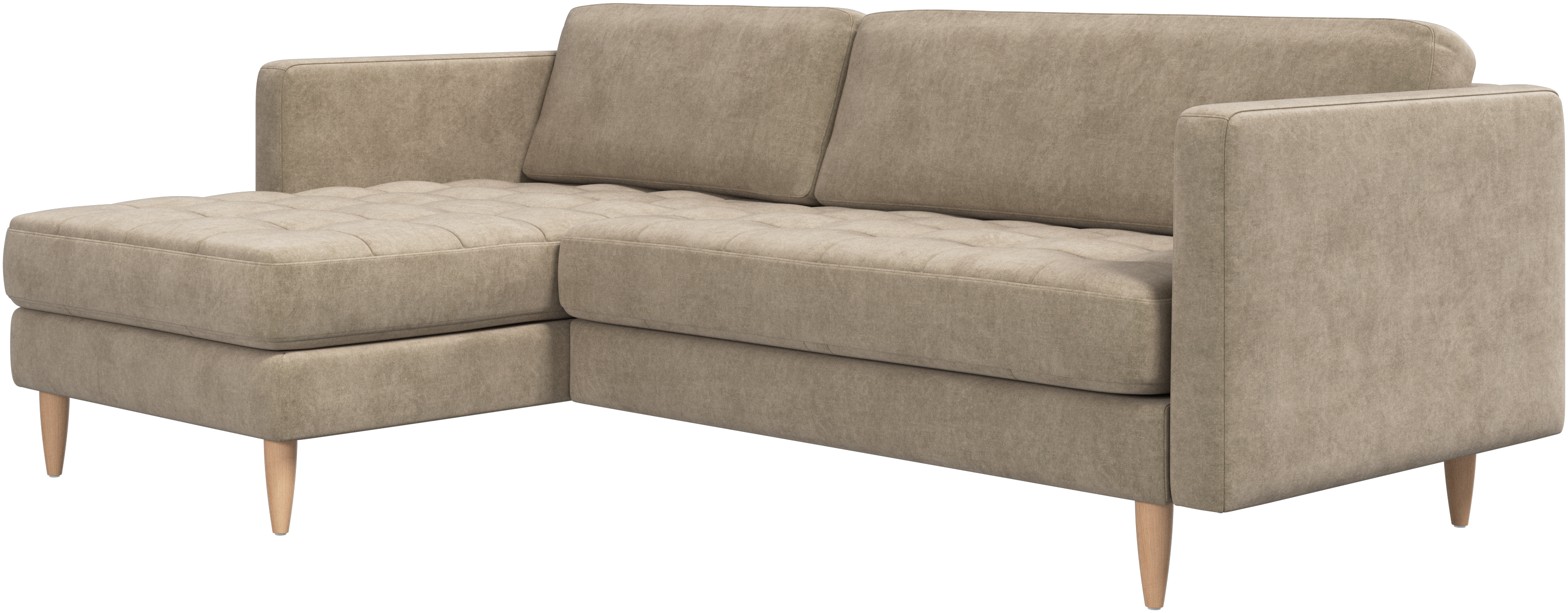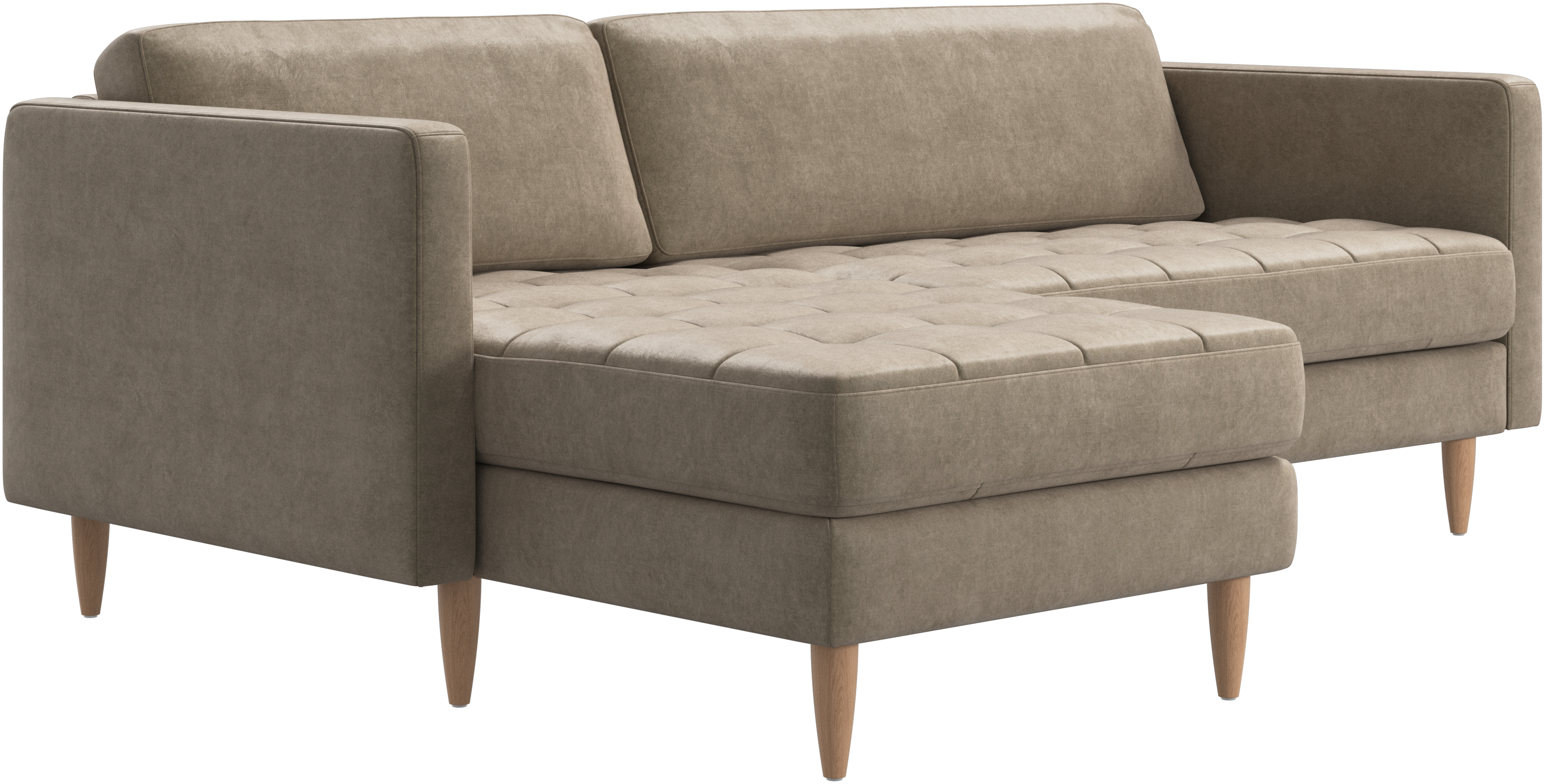 A light look and slim proportions make the Osaka sofa perfect for small homes, while a subtle feminine look and a touch of 60s design ensure that the Osaka sofa still packs a style punch. The beautiful tufted seats add visual softness and bring a classic look to your living room. The classic, straight armrests emphasise the clean lines and Scandinavian look. Put your feet up, stretch out or use it as an extra seat – you won’t be sorry for choosing this comfortable chaise longue sofa.