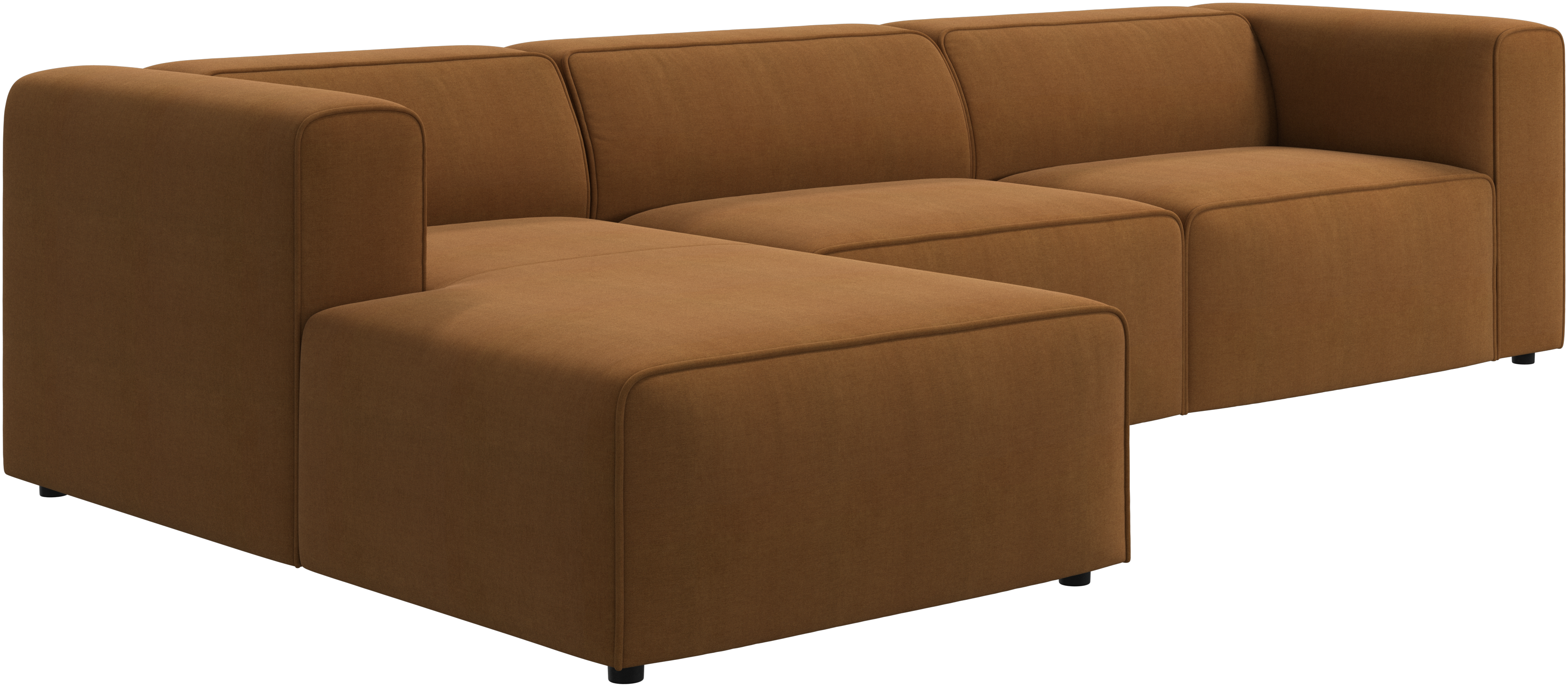 Las patas, con una altura de tan sólo 5 cm, parecen invisibles y el sofá da la impresión de estar casi flotando. Este juego óptico aporta ligereza visual al diseño.