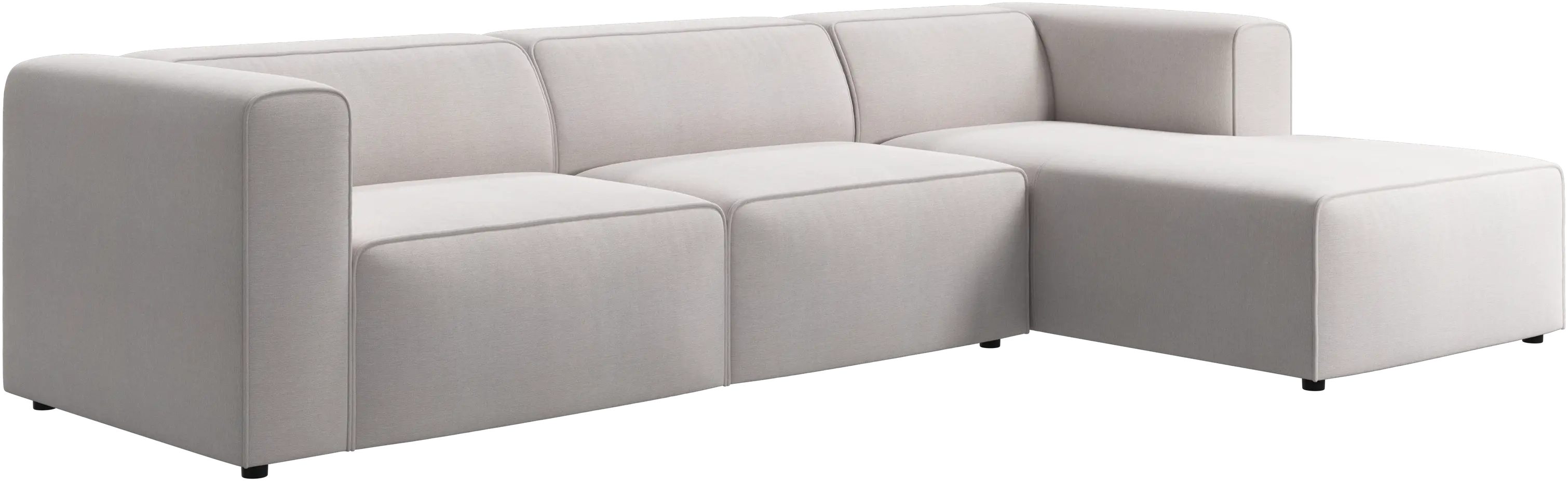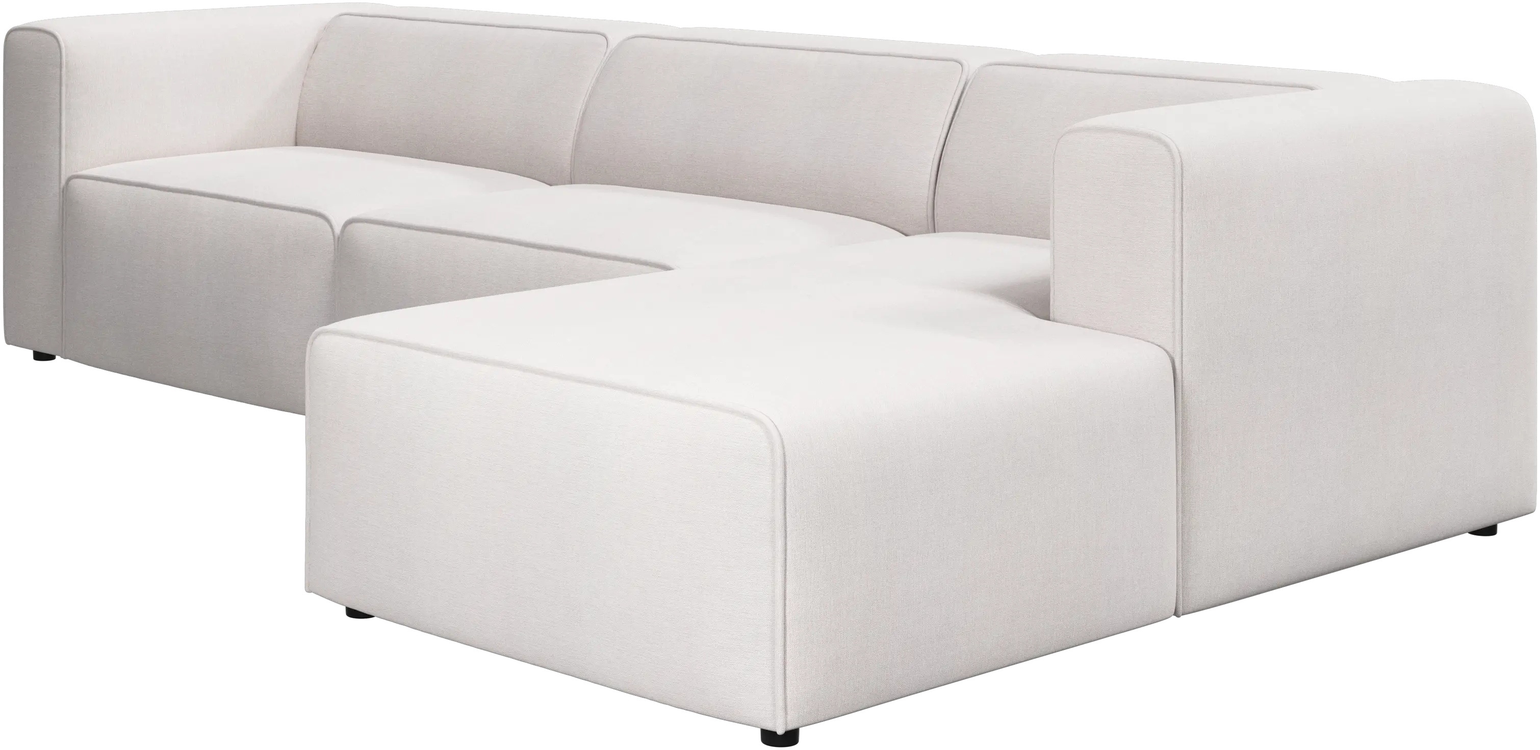 Las patas, con una altura de tan sólo 5 cm, parecen invisibles y el sofá da la impresión de estar casi flotando. Este juego óptico aporta ligereza visual al diseño.