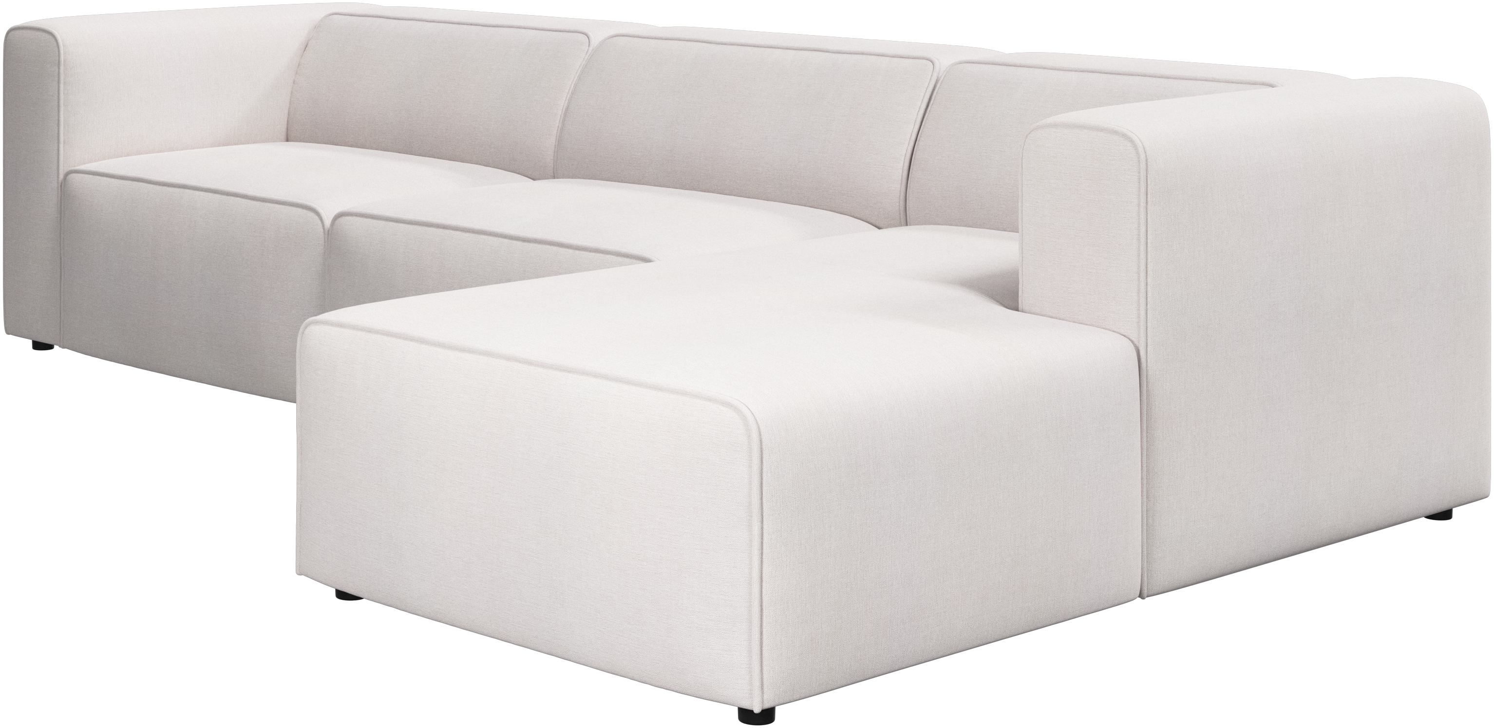 Las patas, con una altura de tan sólo 5 cm, parecen invisibles y el sofá da la impresión de estar casi flotando. Este juego óptico aporta ligereza visual al diseño.