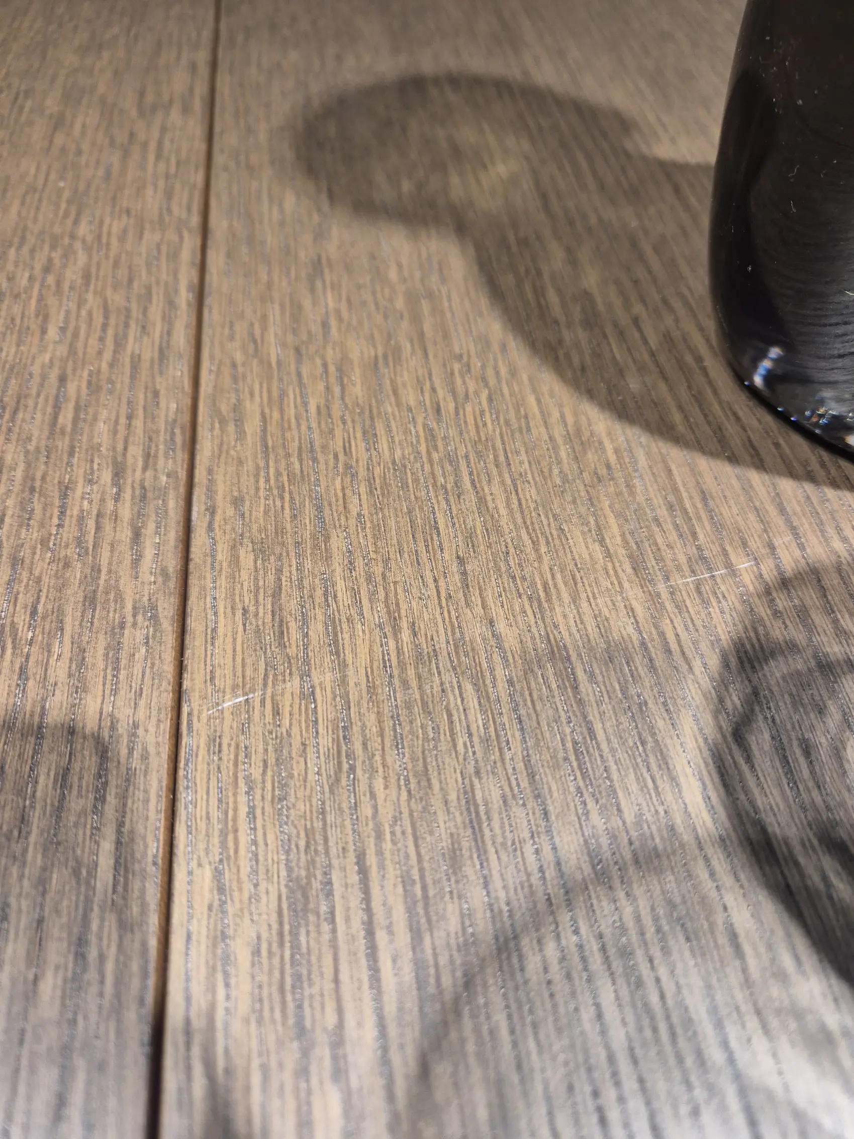 La superficie de la mesa presenta algunos arañazos leves en el tablero principal debido al uso normal. La extensión central se encuentra en perfectas condiciones, sin marcas ni daños visibles. Además, hay un pequeño arañazo en el canto que fue reparado anteriormente. La reparación es estable, aunque el retoque sigue siendo parcialmente visible al observarlo de cerca