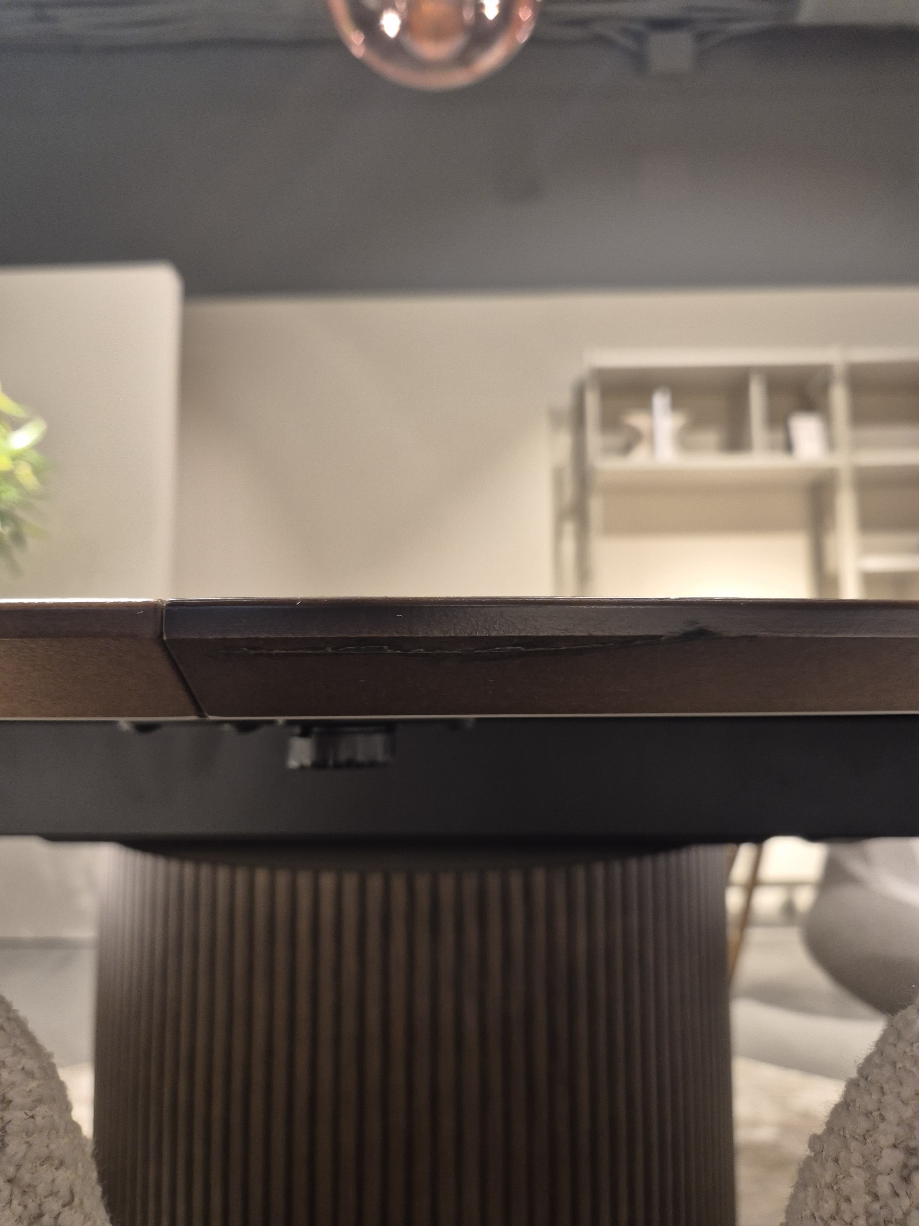 La superficie de la mesa presenta algunos arañazos leves en el tablero principal debido al uso normal. La extensión central se encuentra en perfectas condiciones, sin marcas ni daños visibles. Además, hay un pequeño arañazo en el canto que fue reparado anteriormente. La reparación es estable, aunque el retoque sigue siendo parcialmente visible al observarlo de cerca