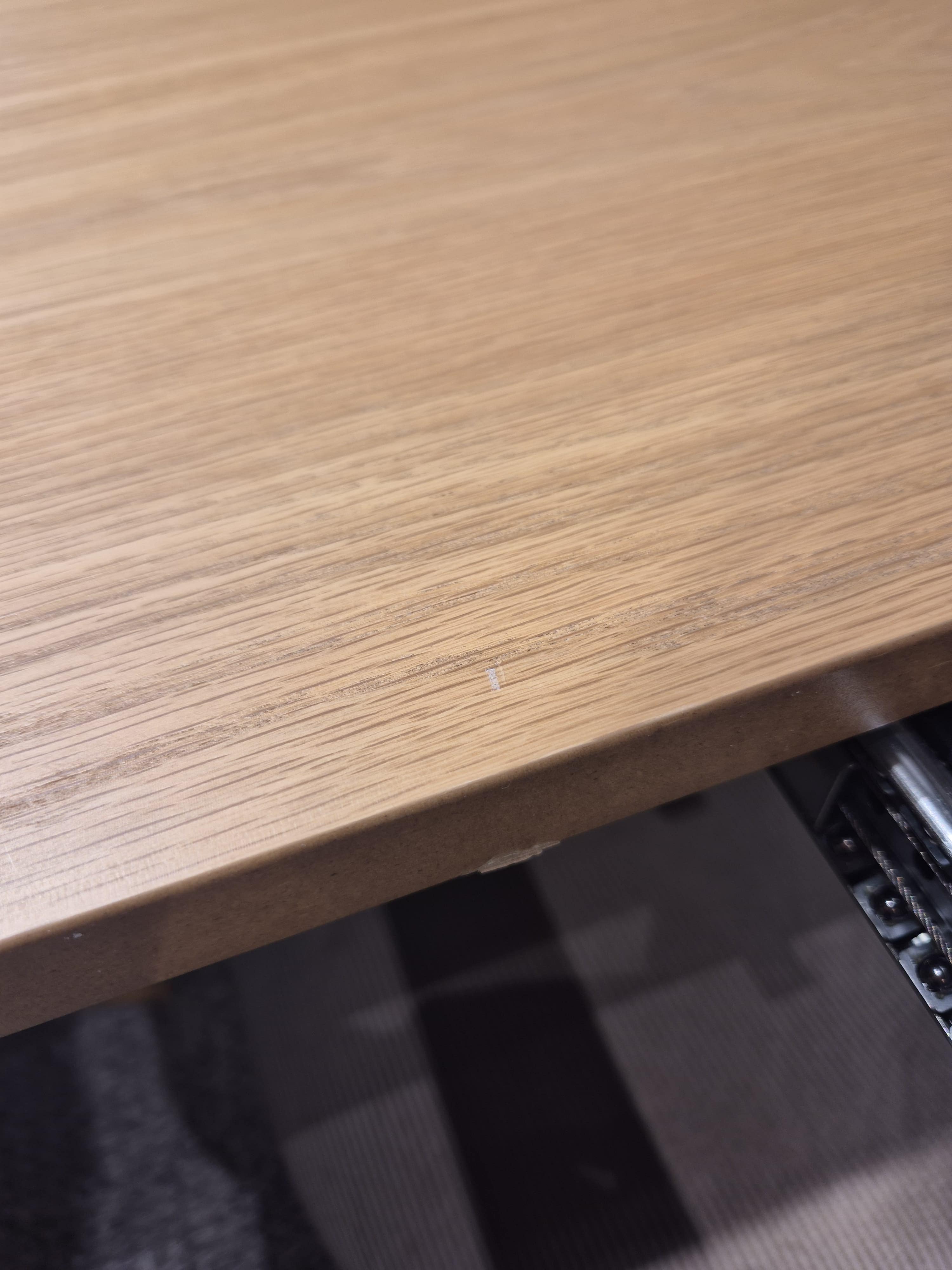 La mesa presenta un par de arañazos en la zona de la división central, justo donde se extiende el tablero. Los arañazos son poco visibles cuando la mesa está cerrada y parecen estar en la superficie del acabado. El resto de la mesa se encuentra en buen estado.