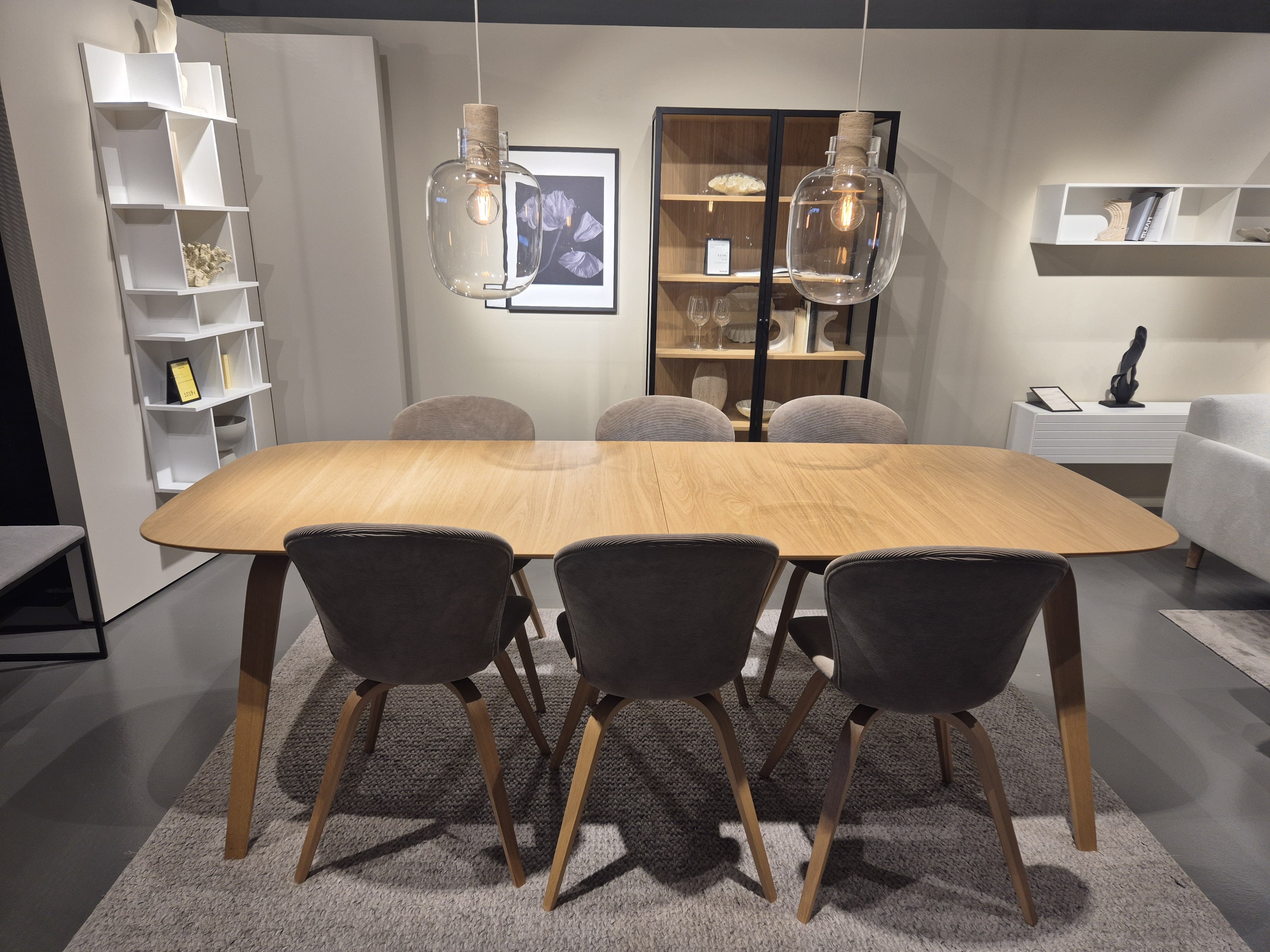 La mesa de comedor Hauge tiene un bastidor de metal negro mate y patas de madera delgadas que le dan un aspecto atemporal y al mismo tiempo contemporáneo.