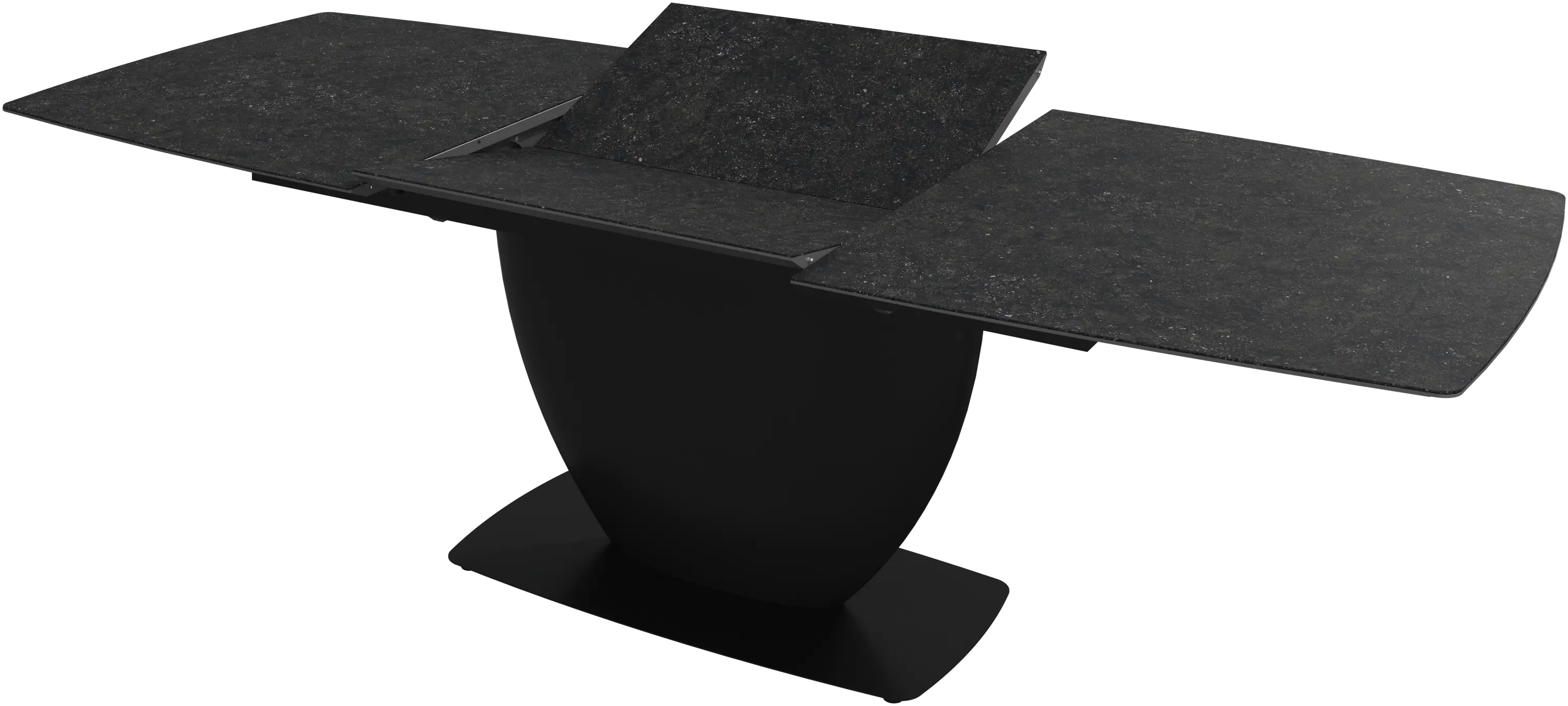 Jatkettava ruokapöytä, kansi tummanharmaa kivikeramiikka ja hiilenharmaa keskijalka.