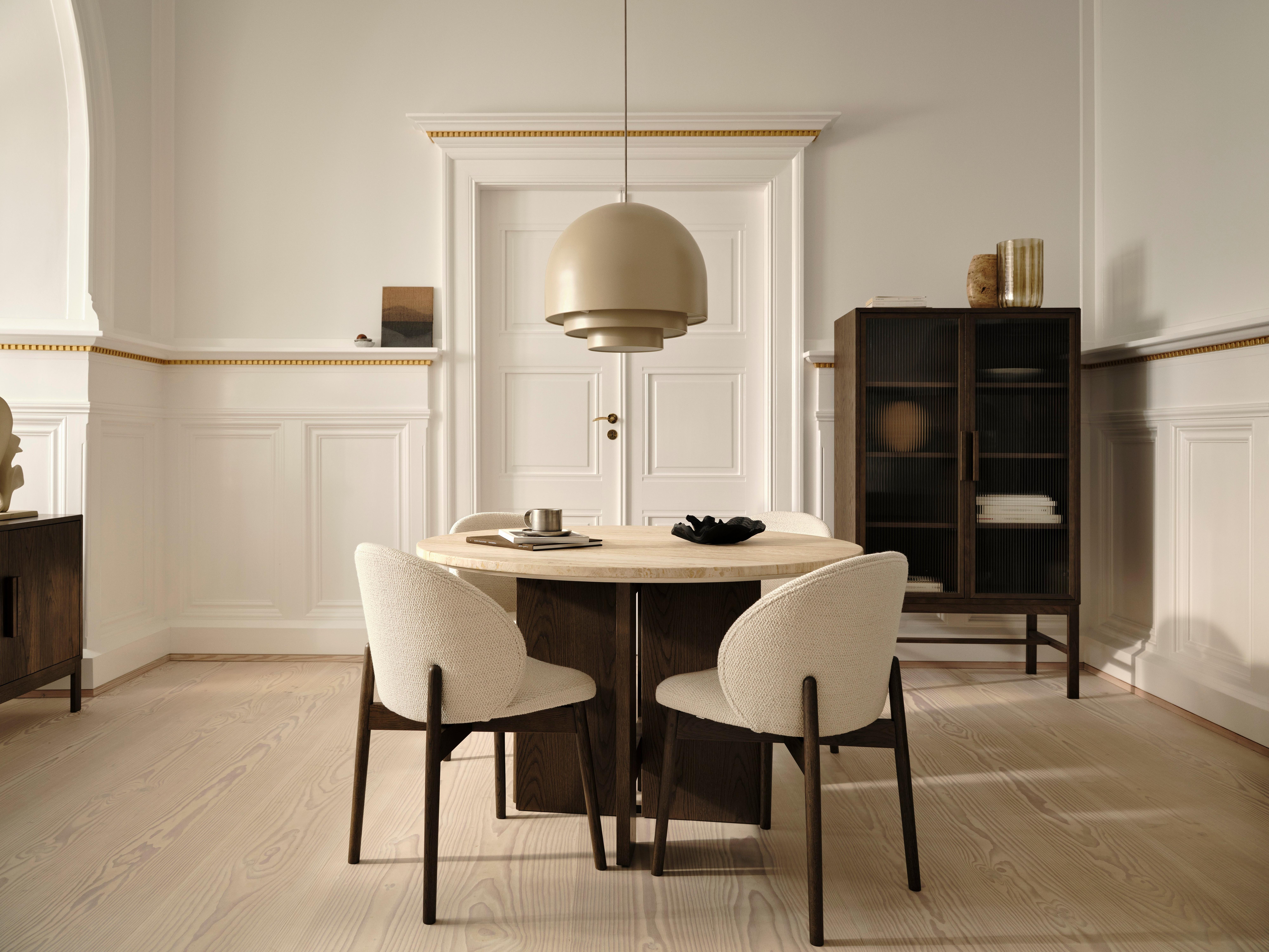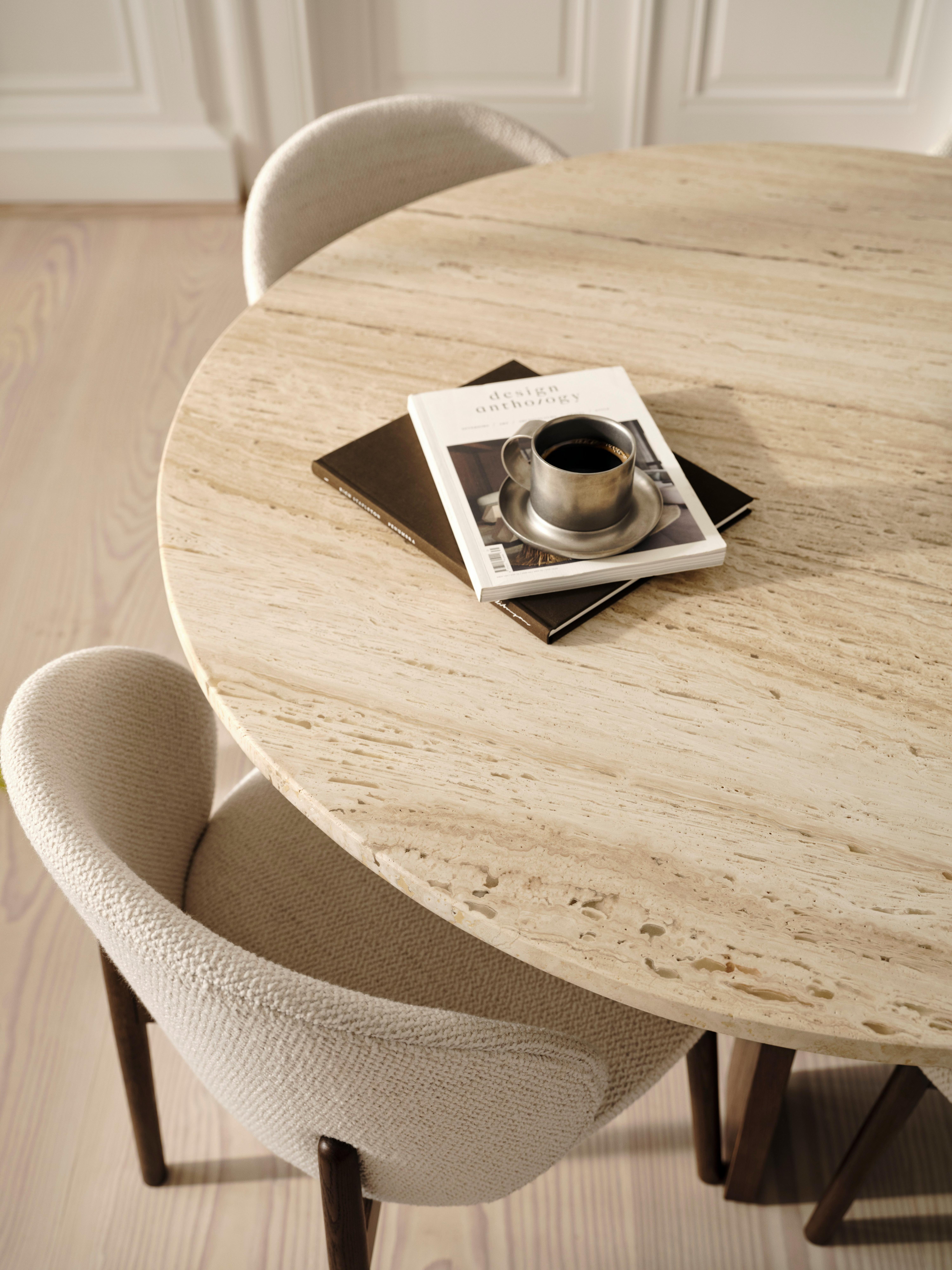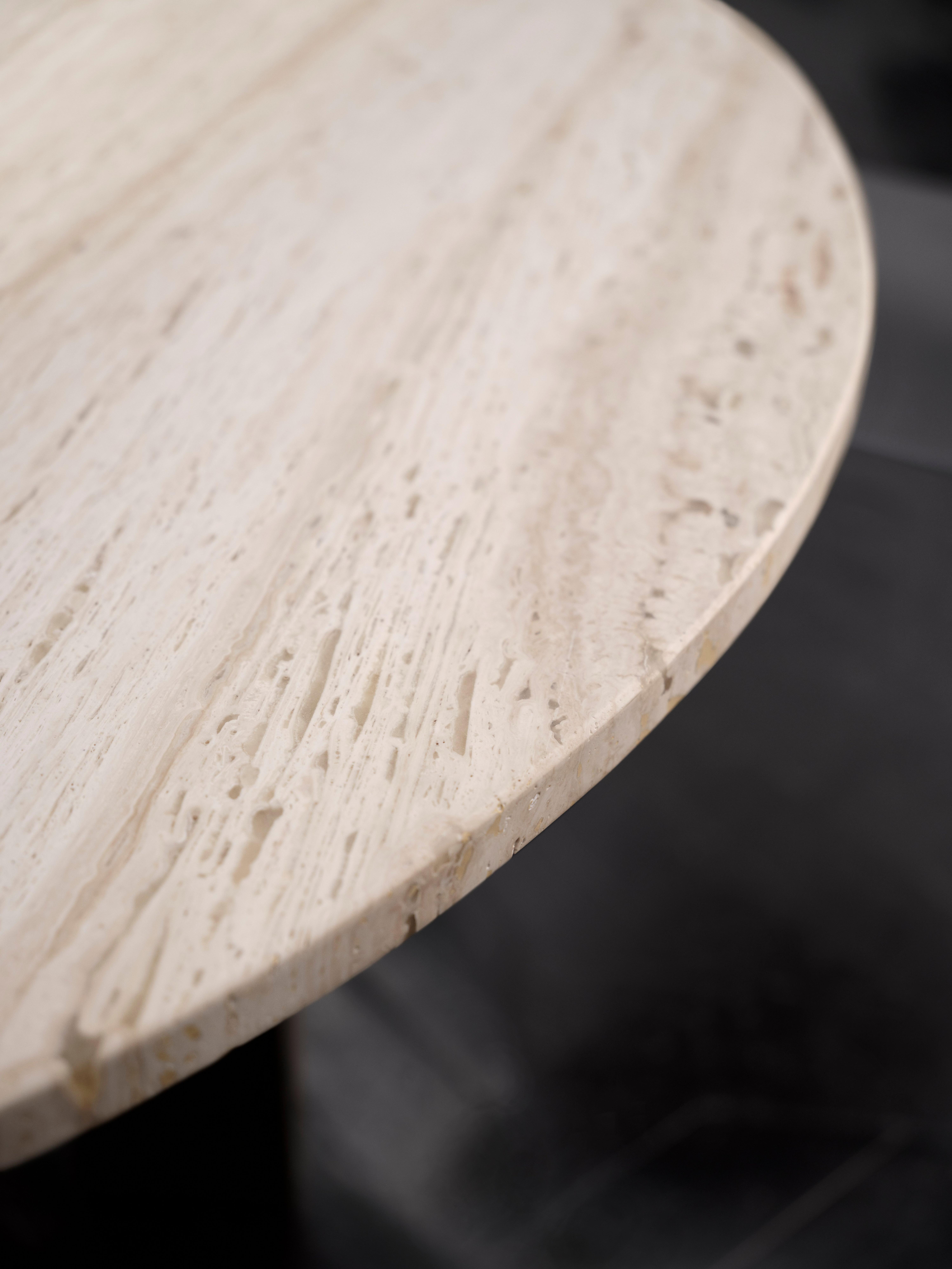Hienostunut pyöreä ruokapöytä luonnollisella travertiinitasolla. Ainutlaatuiset juovakuviot ja lämmin kivipinta tuovat axo-sarjaan syvyyttä – moderni, arkkitehtoninen keskipiste nykyaikaiseen ruokailutilaan.
