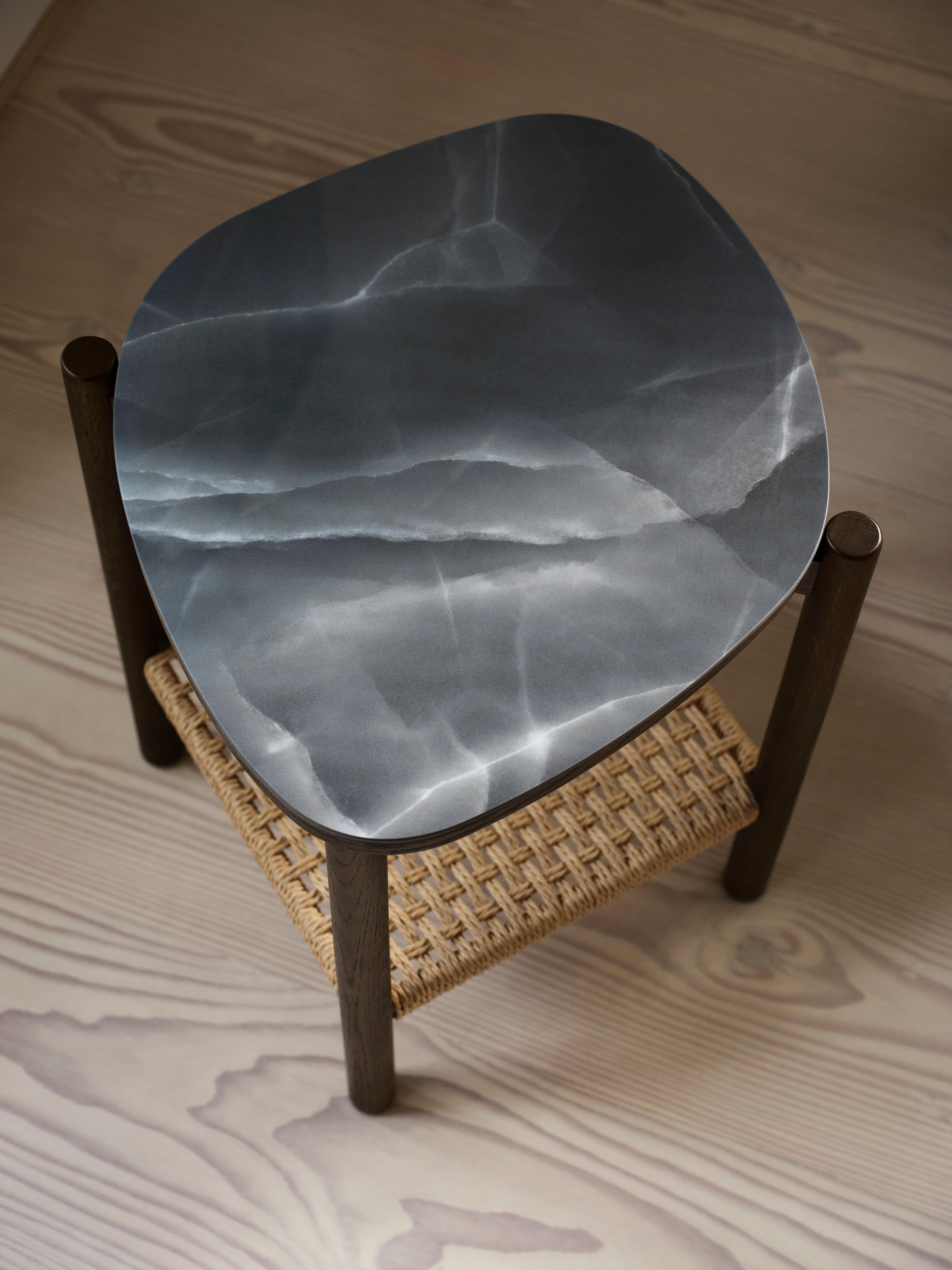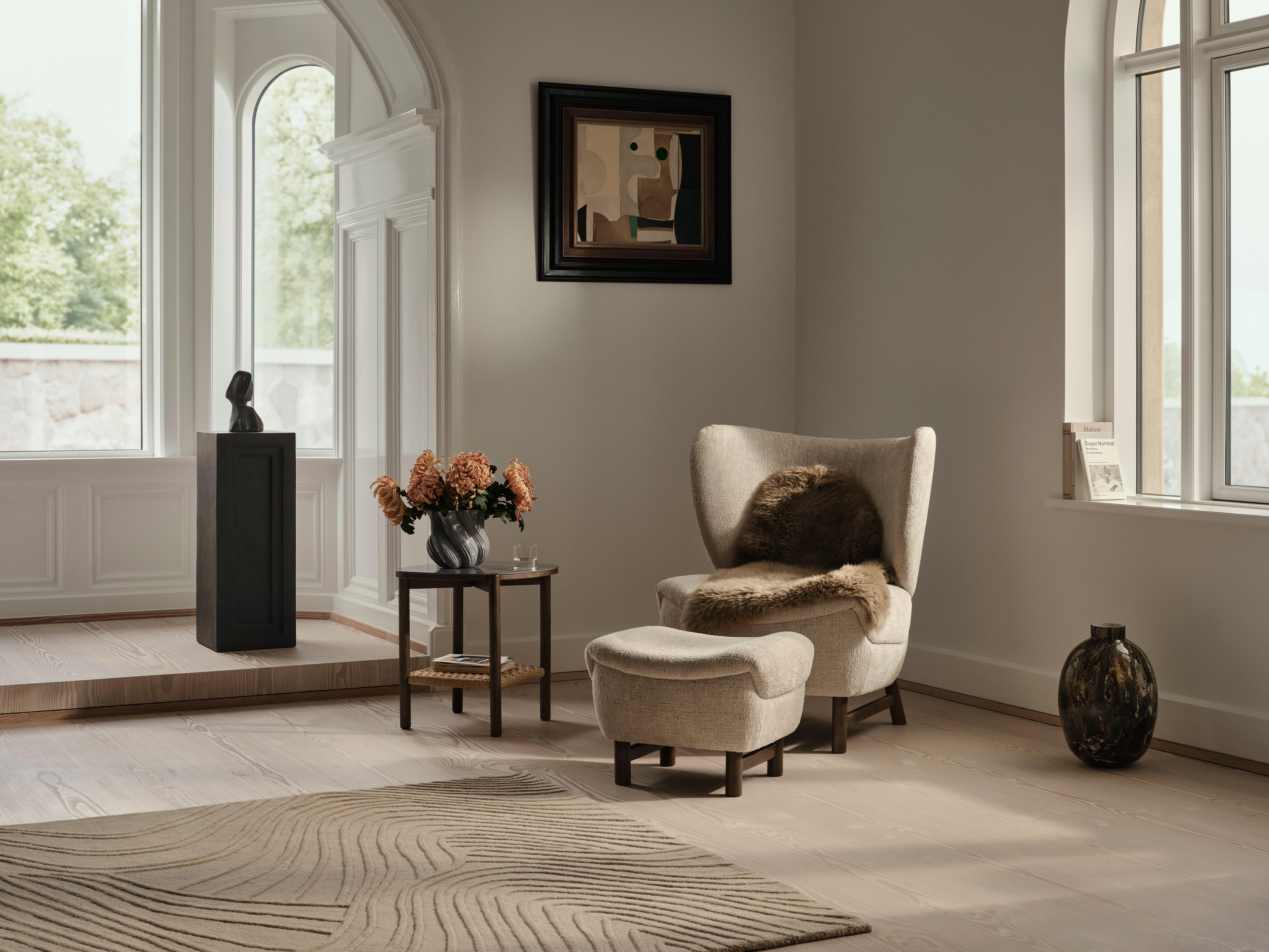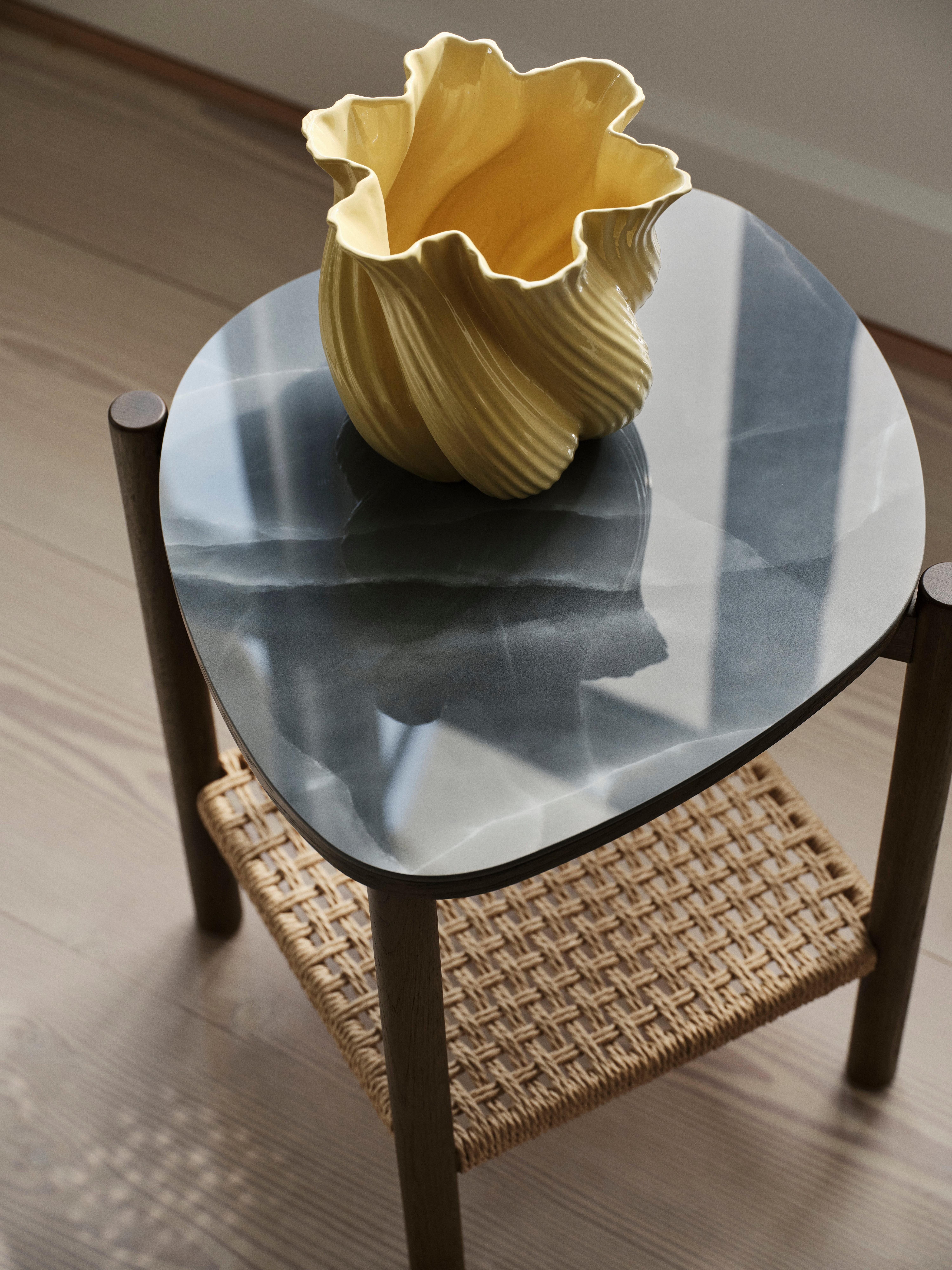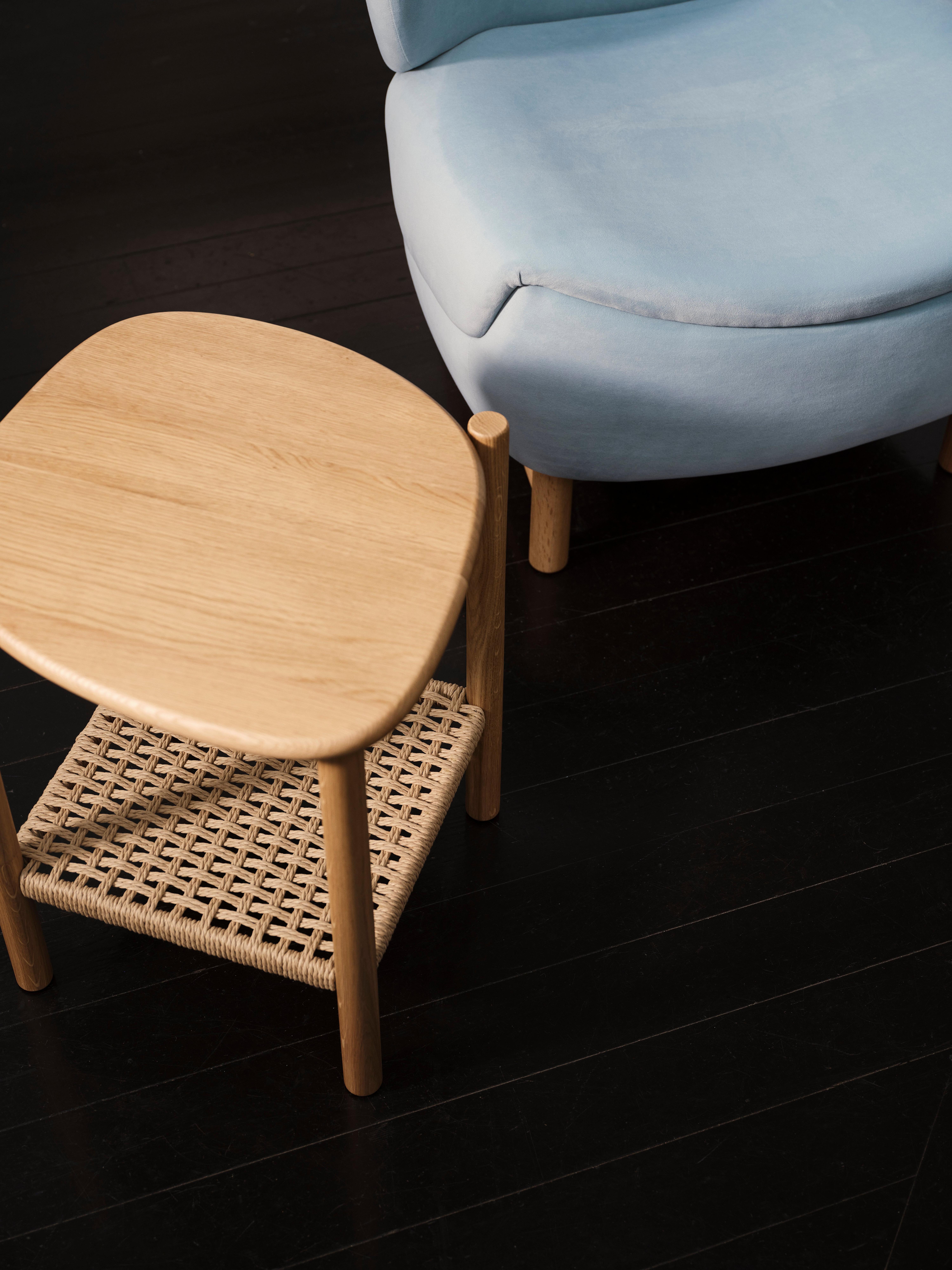 Une table d’appoint sculpturale conçue par Helena Christensen. Le chêne massif et le rotin naturel apportent chaleur et texture, tandis qu’un plateau de table légèrement cannelé ajoute une touche subtile et artisanale, créant un accent apaisant et tactile pour un style de vie moderne.