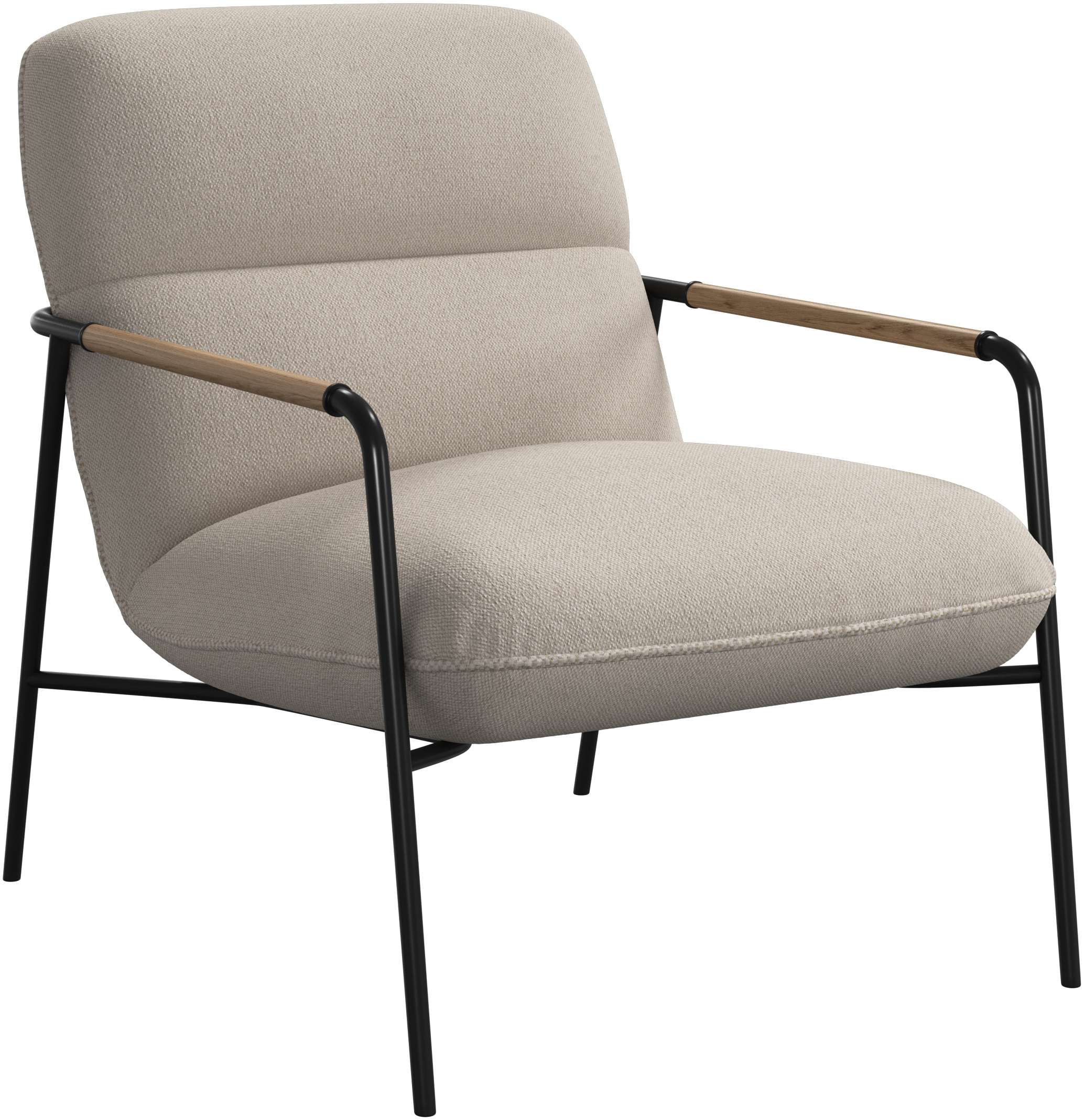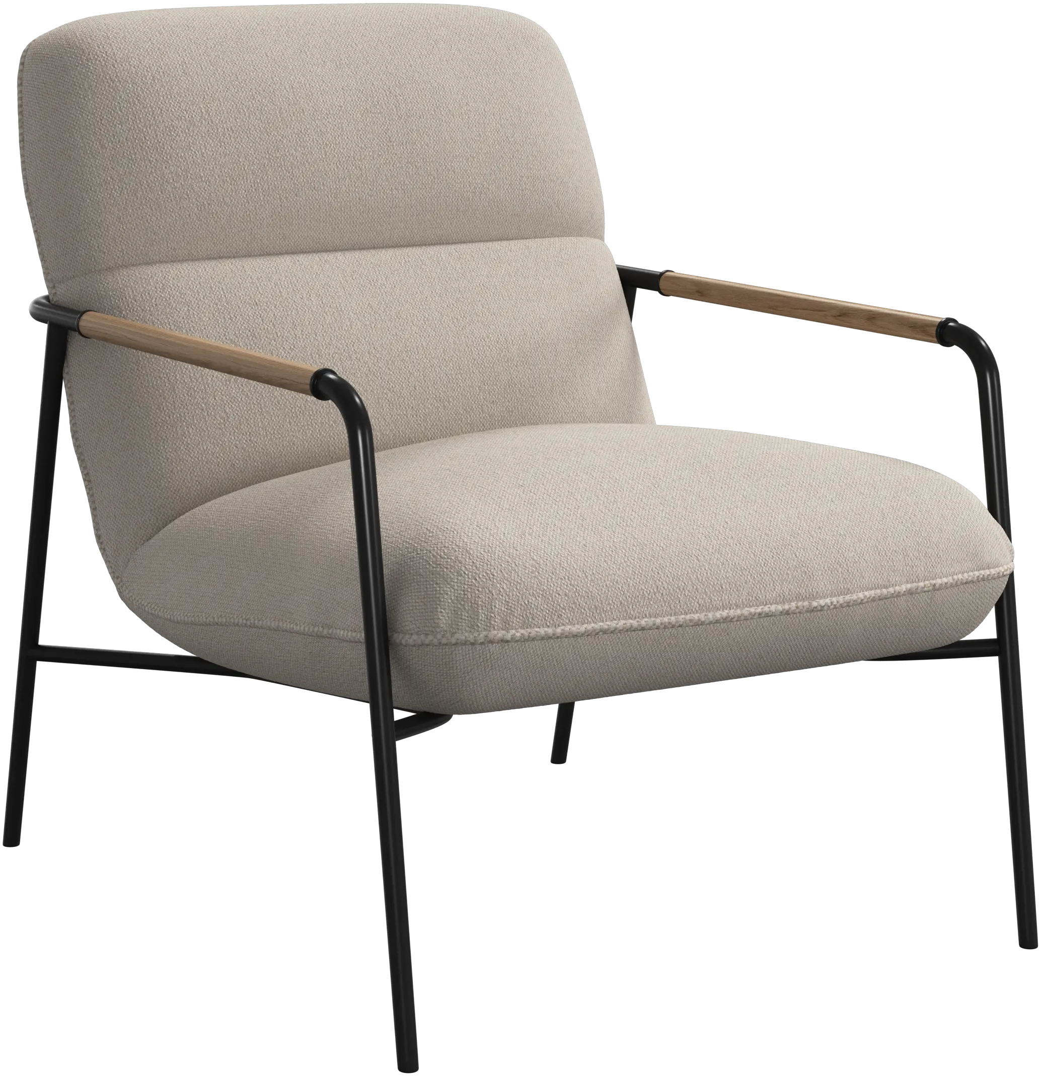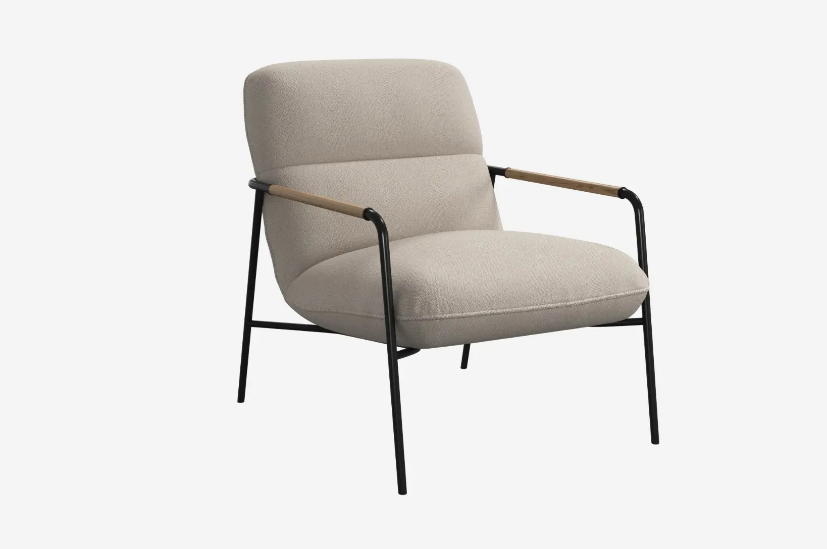 The matte black frame is finished with oak armrests, adding a refined, natural touch to the modern profile.