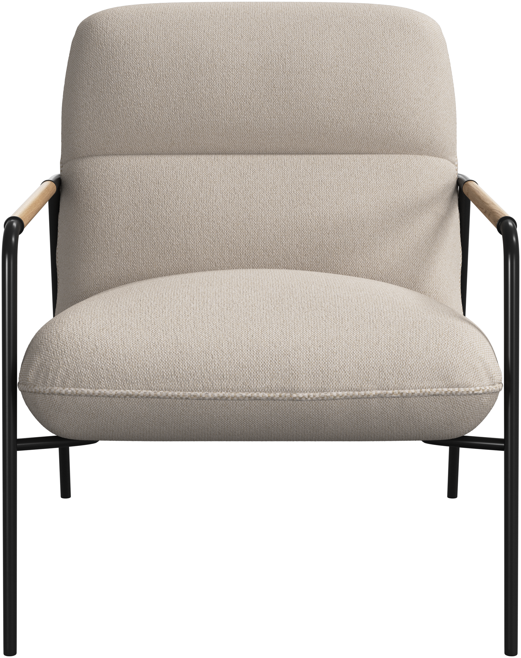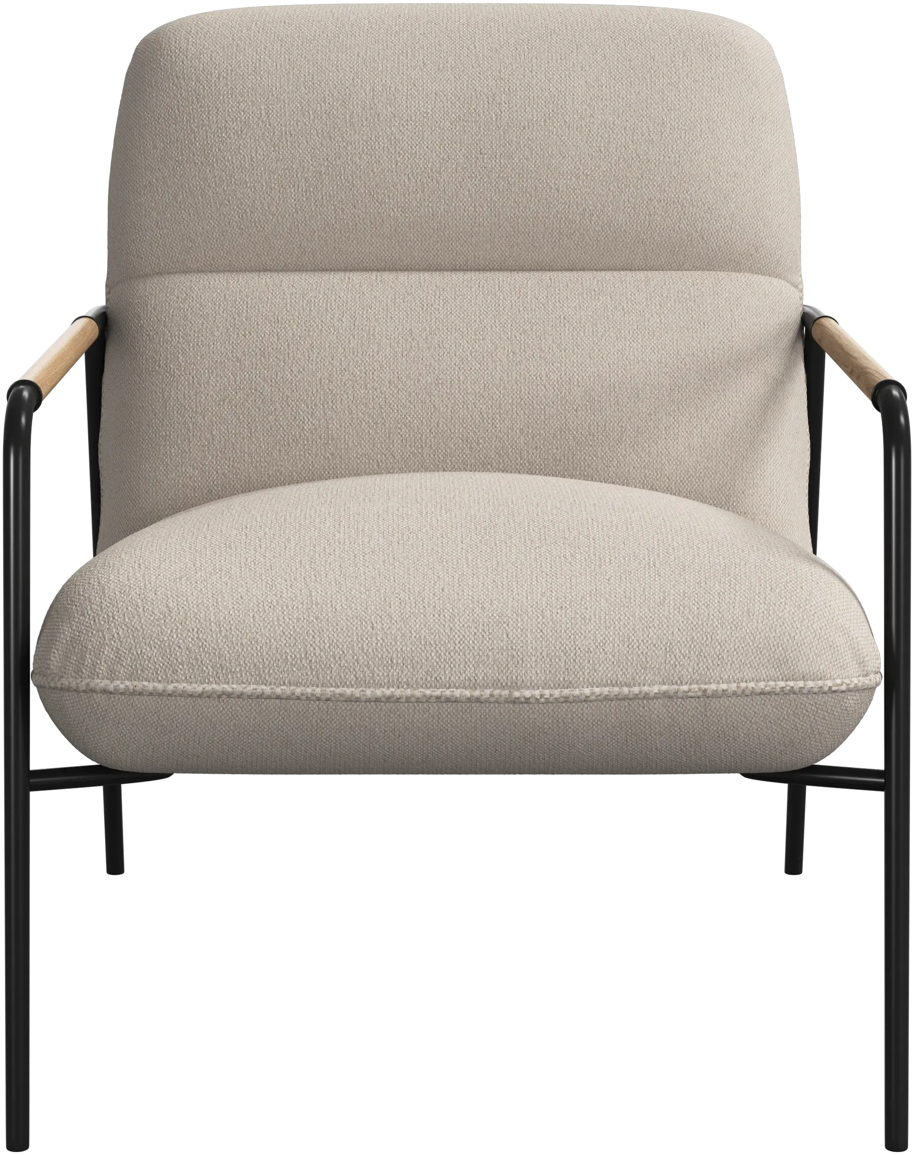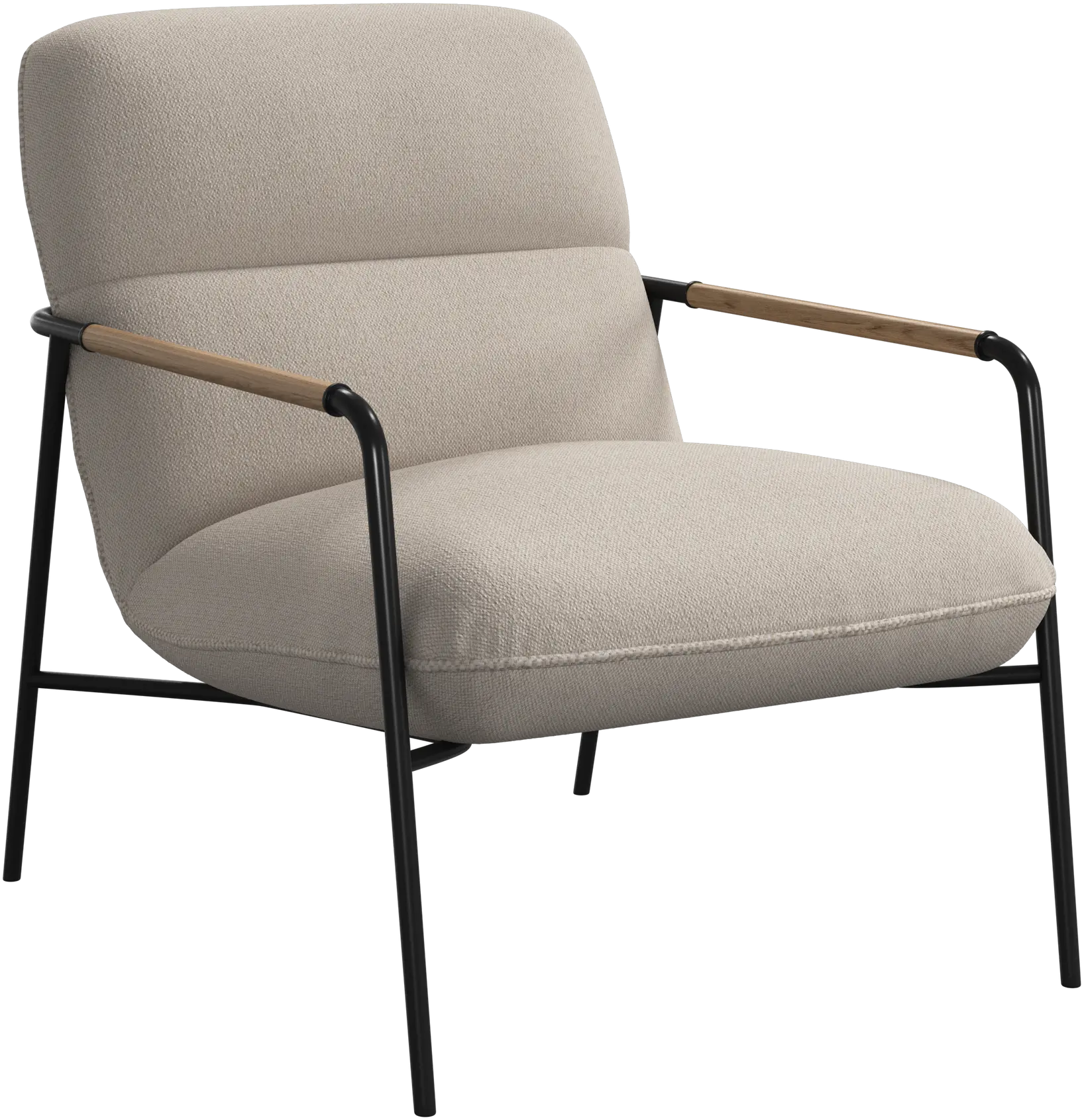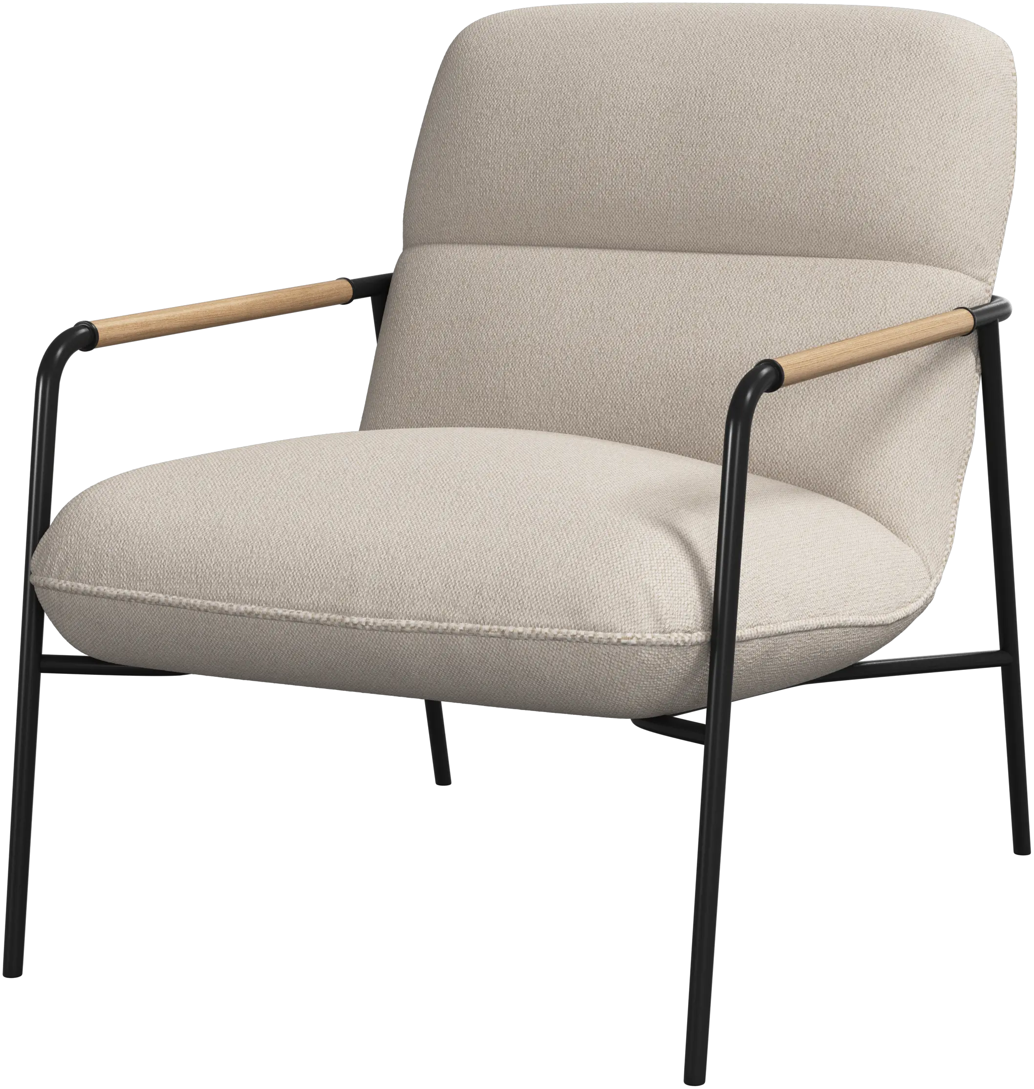 The matte black frame is finished with oak armrests, adding a refined, natural touch to the modern profile.