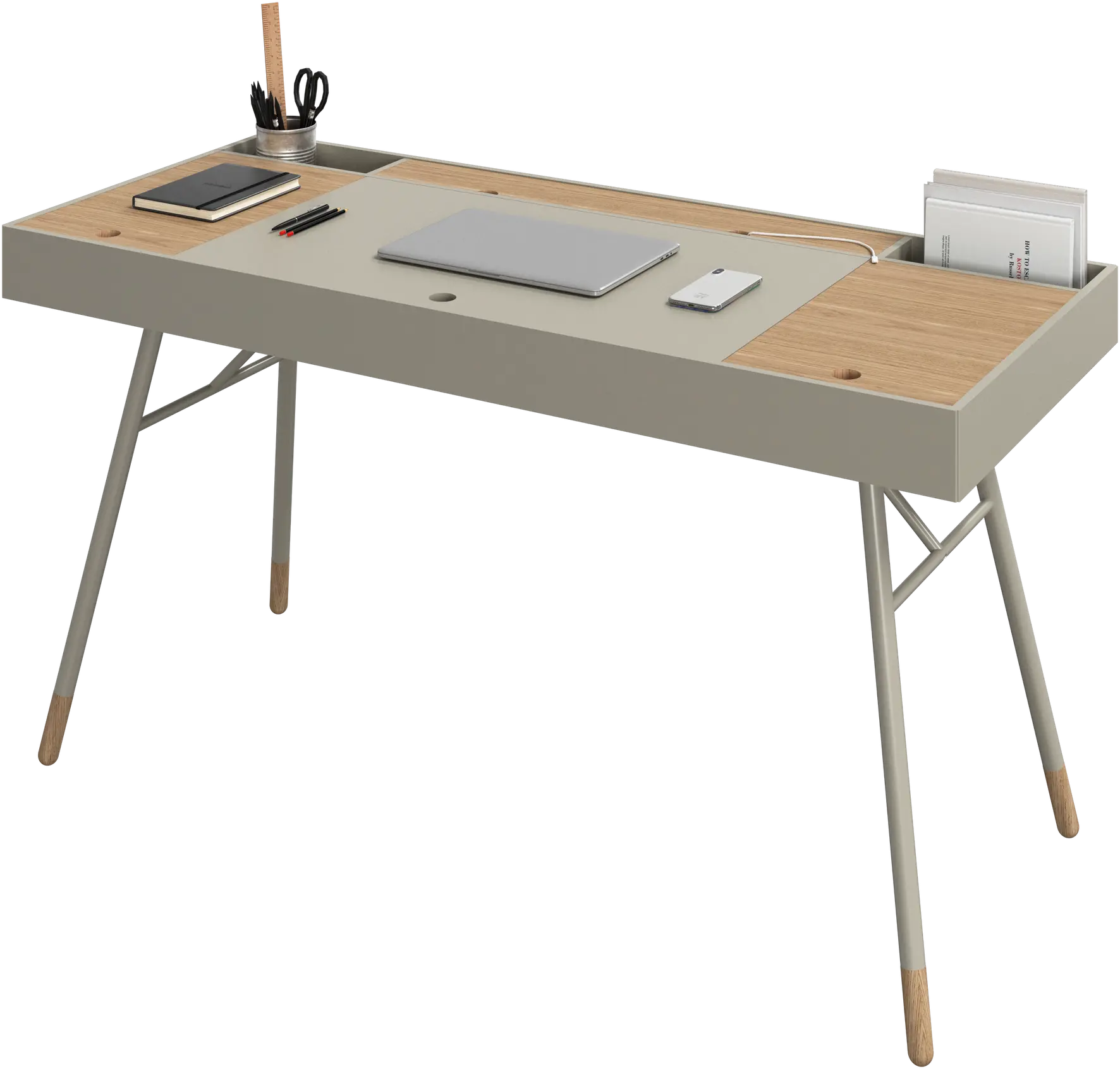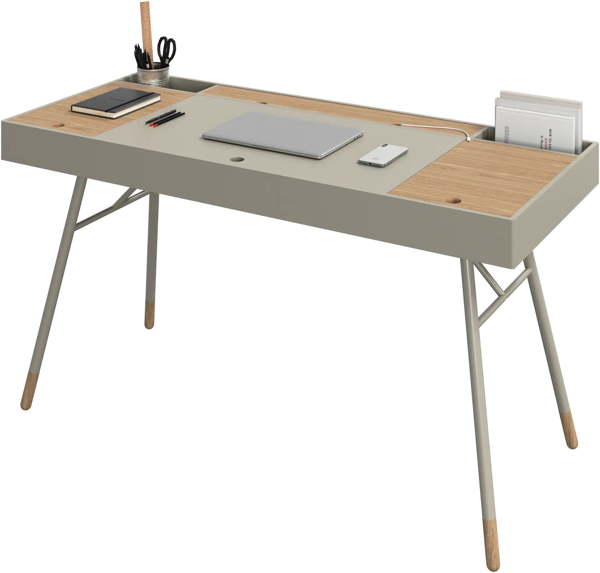Le design des pieds combine les différents matériaux du plateau du bureau pour un style élégant et harmonieux qui lui permet de s’adapter n’importe où.