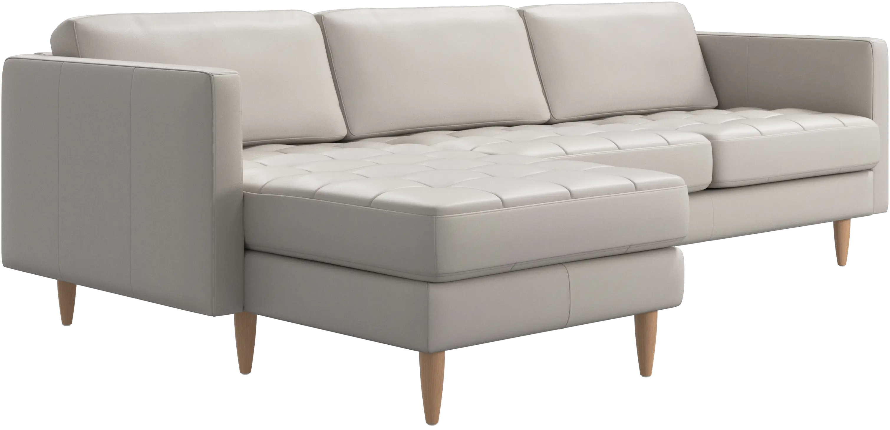 Lätthet och slanka proportioner gör soffan Osaka perfekt för mindre hem. Tack vare sin diskret feminina look och 60-talsstil gör soffan ändå ett starkt intryck. De vackra, tuftade sittkuddarna ger ett mjukt visuellt intryck och skapar en klassisk look i ditt vardagsrum. De klassiska, raka armstöden lyfter fram de rena linjerna och den skandinaviska stilen. Skaffa en bekväm soffa med vilmodul och du kommer aldrig att ångra dig. Lägg upp fötterna, sträck ut dig eller använd den som extra sittplats.