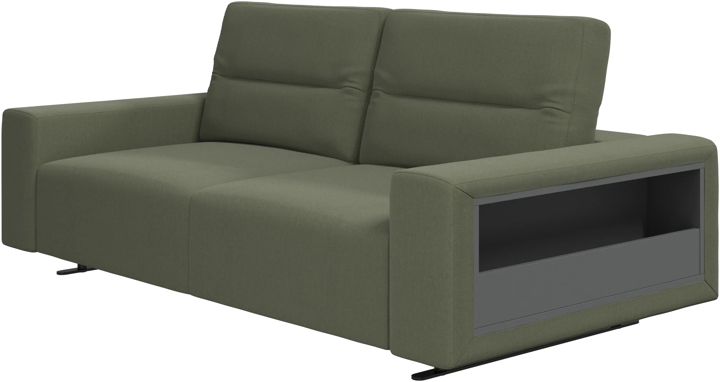 Förvara böcker, tidningar och annat i de integrerade förvaringsutrymmena i armstöden och fotpallen.