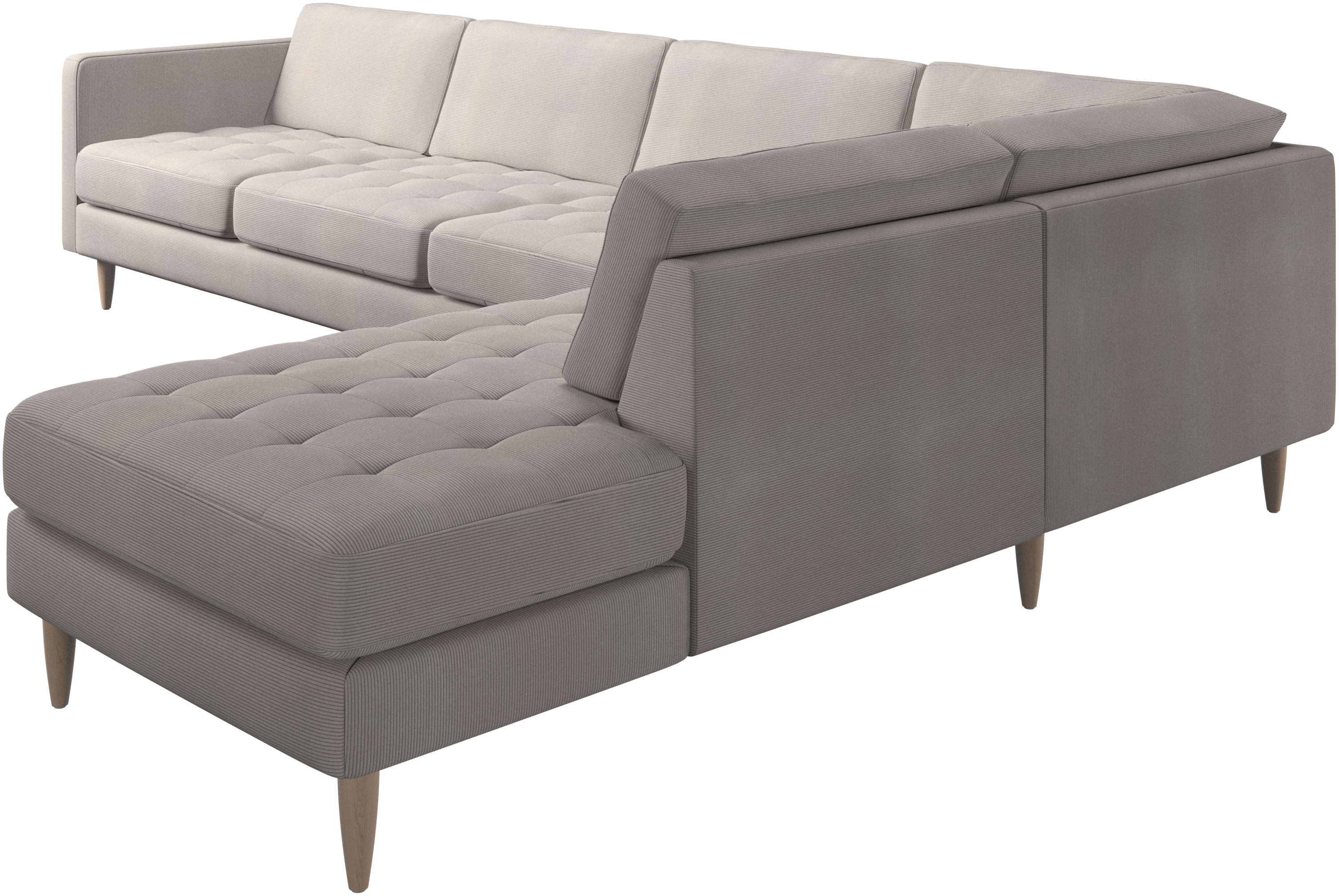Lätthet och slanka proportioner gör soffan Osaka perfekt för mindre hem. Tack vare sin diskret feminina look och 60-talsstil gör soffan ändå ett starkt intryck. De vackra, tuftade sittkuddarna ger ett mjukt visuellt intryck och skapar en klassisk look i ditt vardagsrum. De klassiska, raka armstöden lyfter fram de rena linjerna och den skandinaviska stilen. Med gott om plats för hela familjen blir denna hörnsoffa vardagsrummets stora favorit. Det öppna avslutet skapar en dynamisk och välkomnande atmosfär – perfekt för multifunktionella ytor i öppna planlösningar.