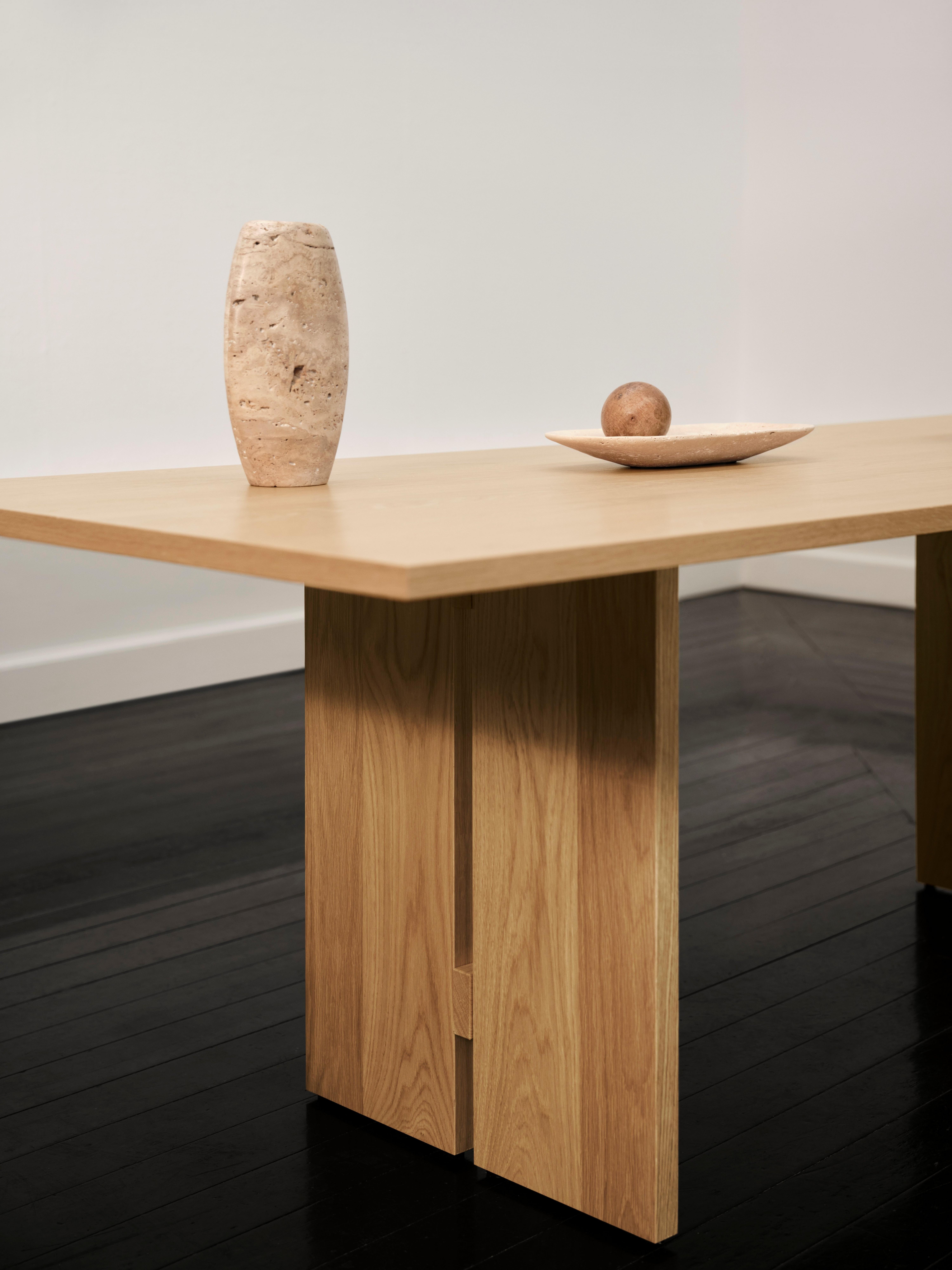 Современный прямоугольный обеденный стол от atelier axo. Четкие линии, сбалансированные пропорции и изысканная столешница из шпона дуба создают архитектурный минималистичный образ для современной столовой.