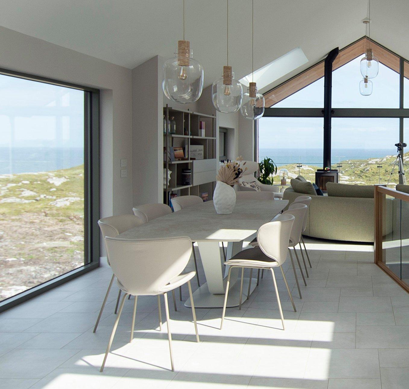 Hamilton 椅子的獨特曲線和簡約優雅奠定了居家的基調,帶來寧靜而令人驚嘆的視野。 Baile An Or,蘇格蘭