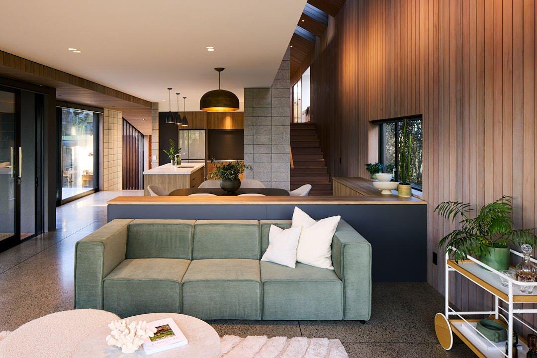 低靠背 Carmo 沙發營造出休閒的外觀,呼應裝潢的俐落線條,另外搭配 Madrid 咖啡桌和 Eden 腳凳。Waikanae Beach,紐西蘭